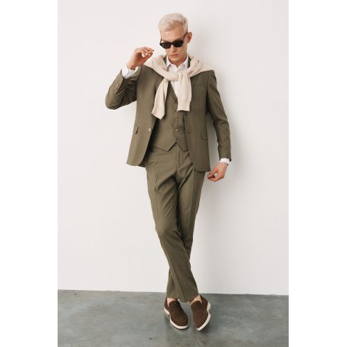 Оливковый тройка‑костюм в диагональную фактуру - современный и стильный вариант на тёплое время года. Ткань с диагональным плетением создаёт выразительную текстуру, которая придаёт образу глубину и характер. Приталенный пиджак, жилет и брюки формируют цельный, собранный силуэт. Оливковый оттенок смотрится сдержанно и свежо - подходит для мероприятий, прогулок или образов с акцентом на индивидуальность. Отличный выбор для тех, кто ценит лаконичность, структуру и комфорт.