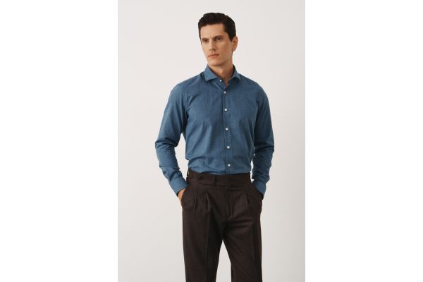 Сдержанный и выразительный синий костюм с двубортным пиджаком и накладными карманами. Такая конструкция отсылает к классике, где важна и форма, и функция. Итальянские лацканы подчёркивают плечи, придавая образу чёткость. Защипы на брюках обеспечивают удобную посадку и свободу движения. Глубокий синий остаётся универсальным, но не теряет индивидуальности. Костюм для тех, кто выбирает точность в деталях и комфорт в движении.