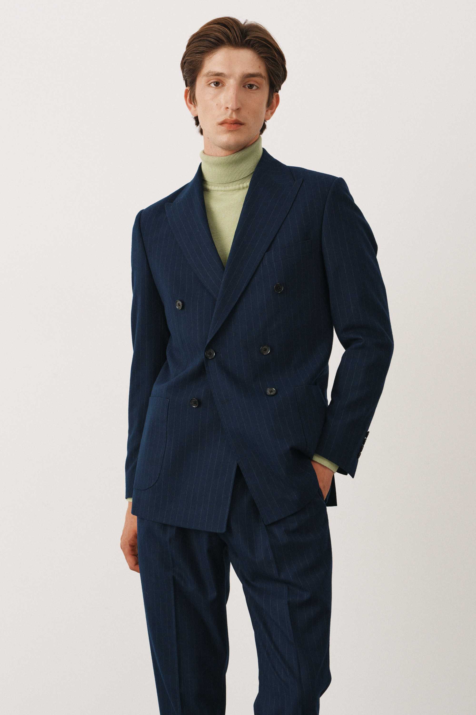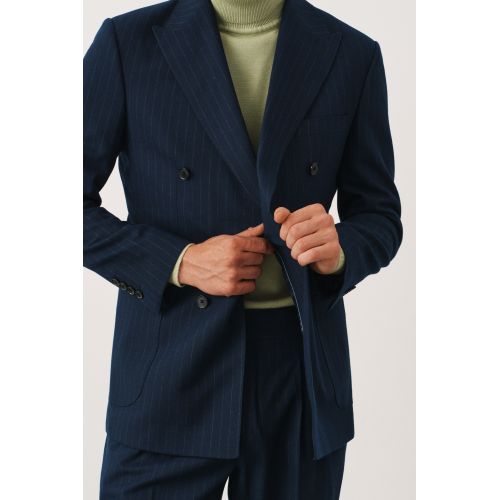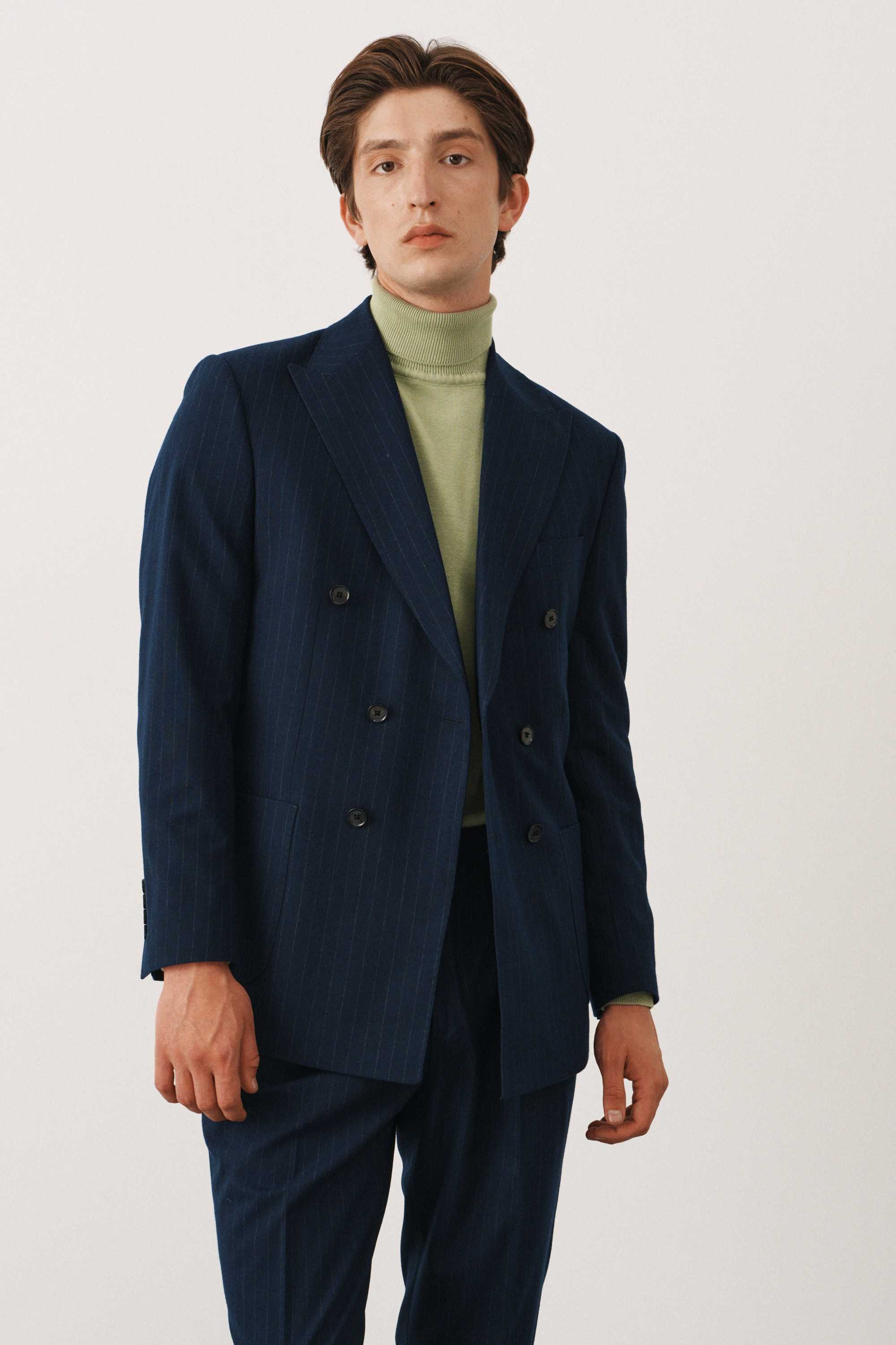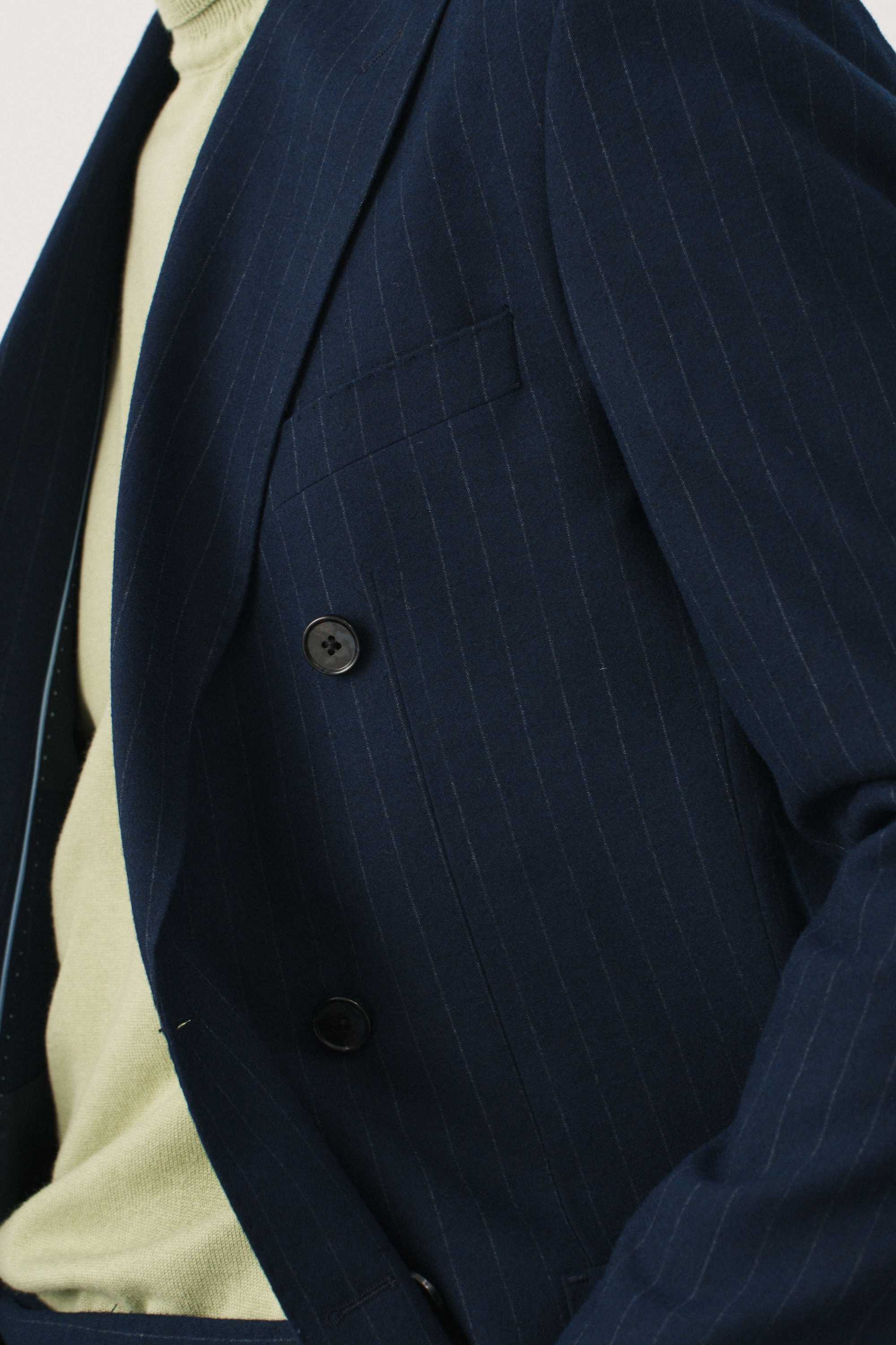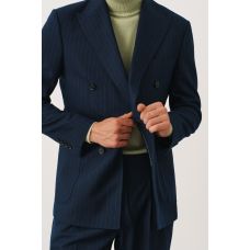 Костюм синий в полоску двубортный с накладными карманами, брюки с защипами