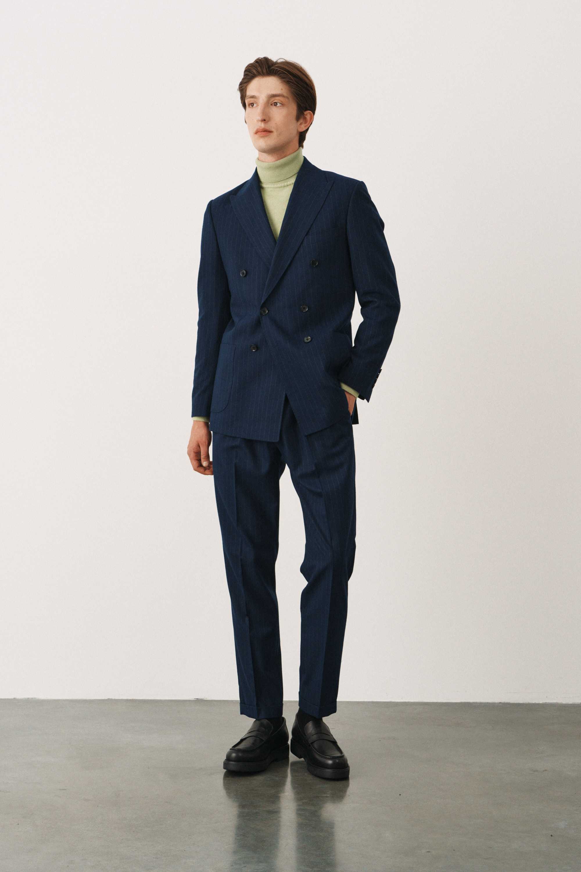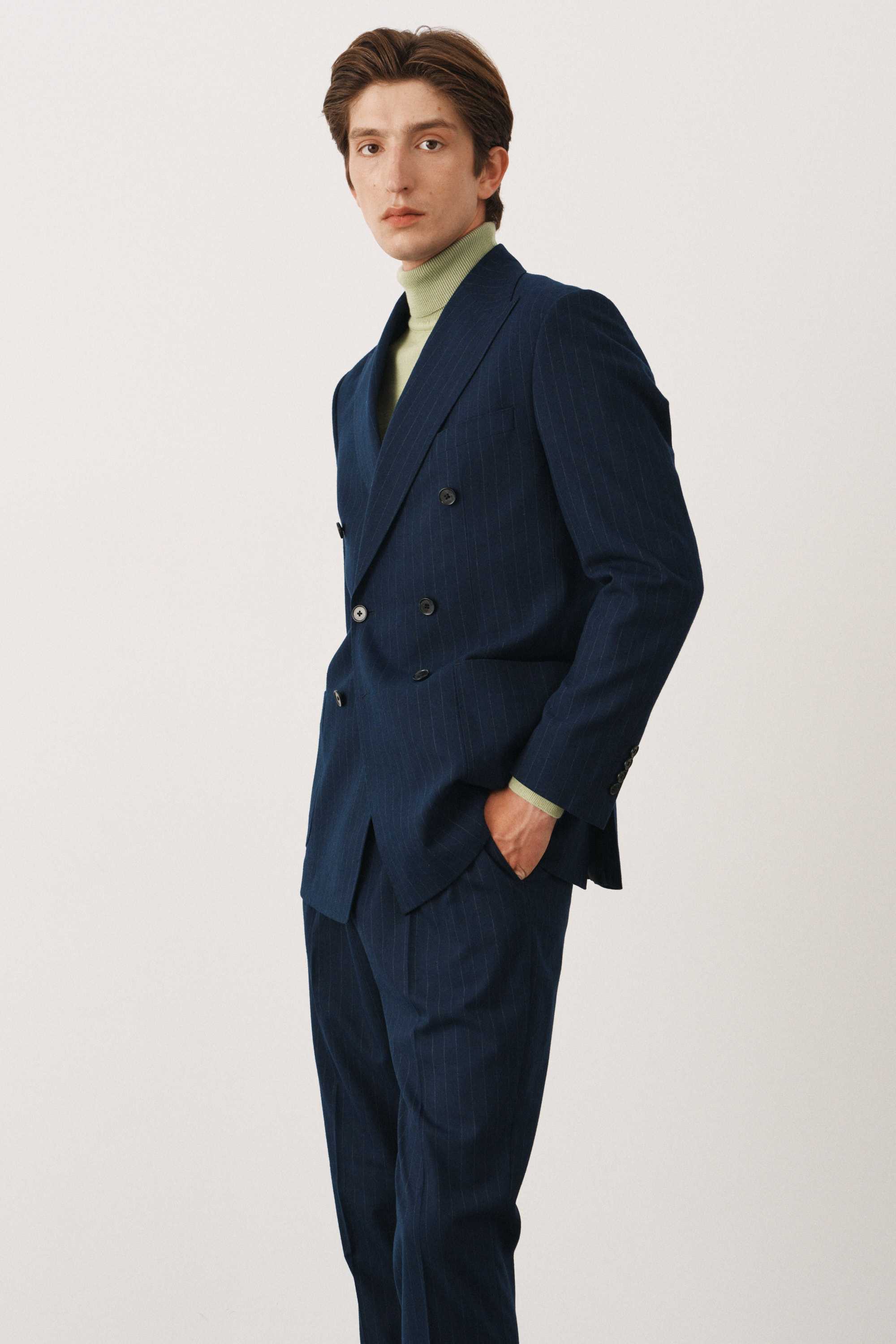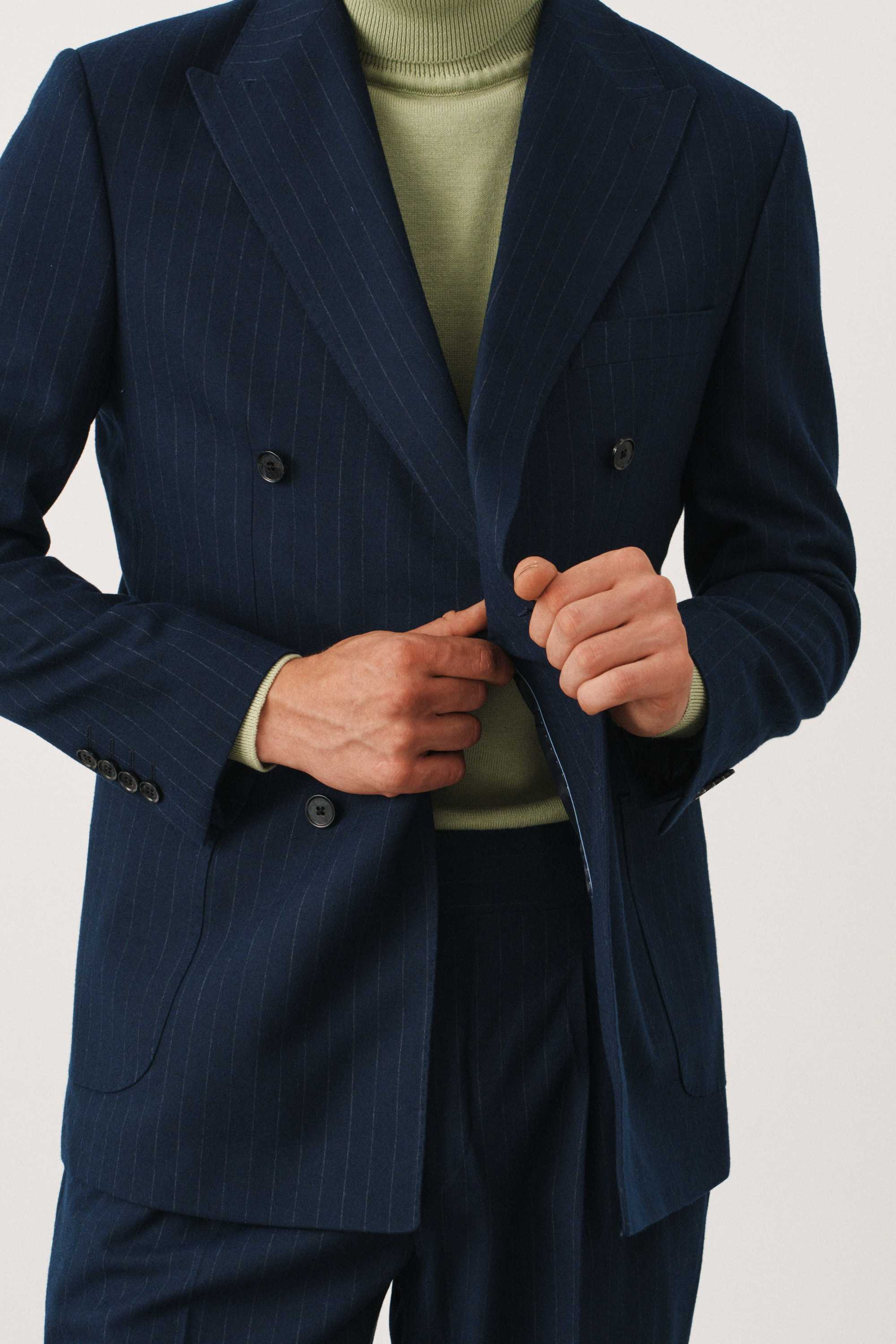Костюм синий в полоску двубортный с накладными карманами, брюки с защипами