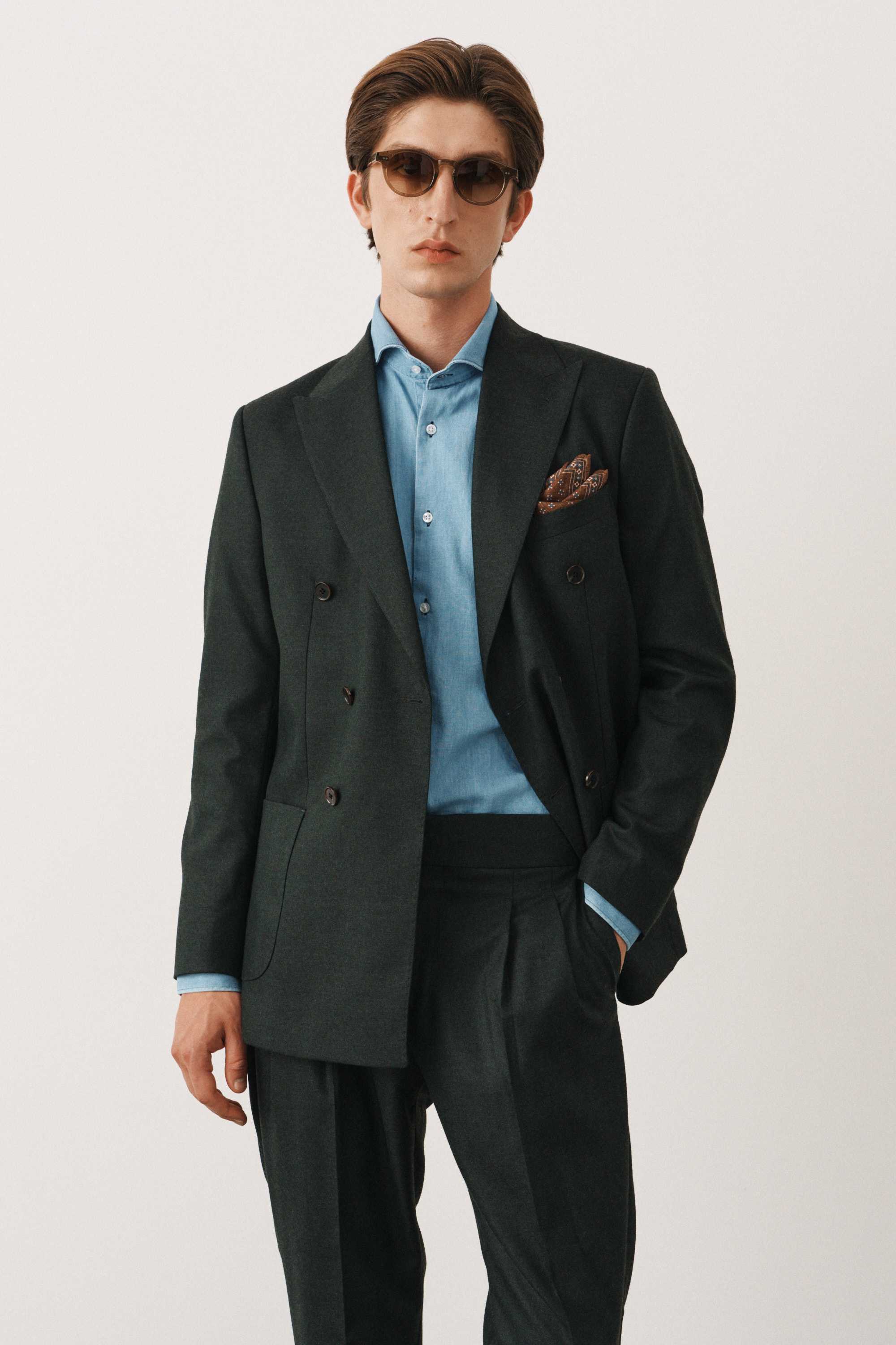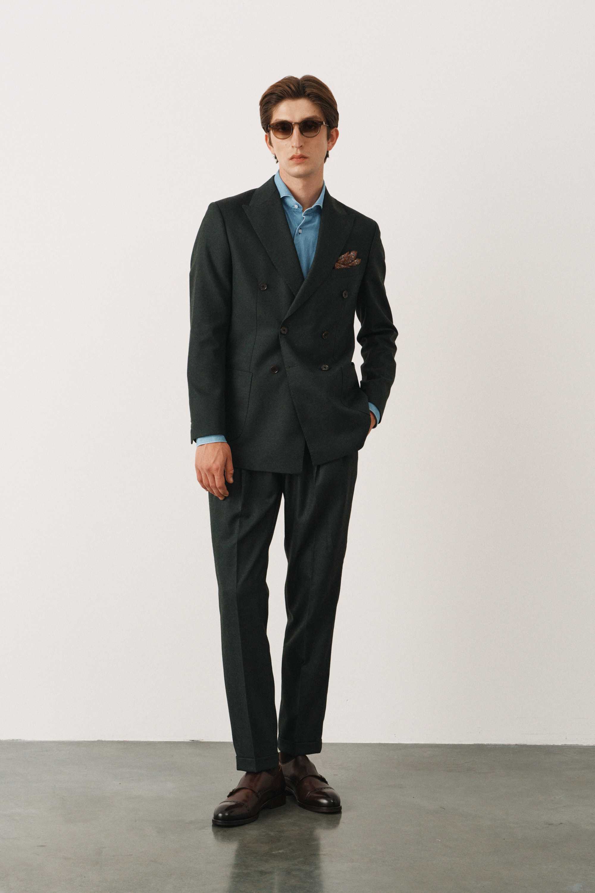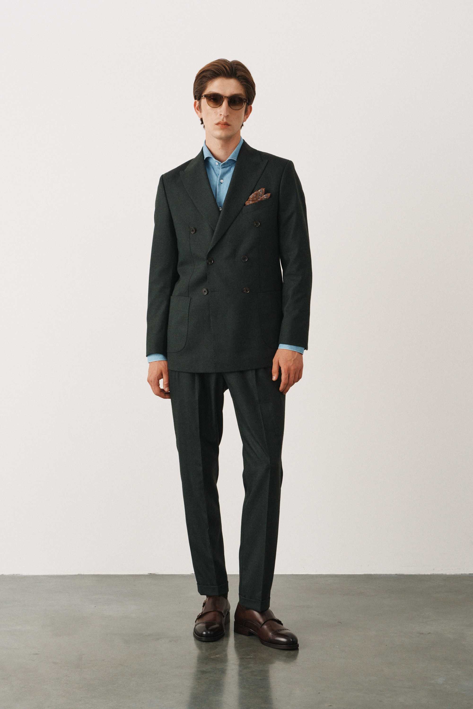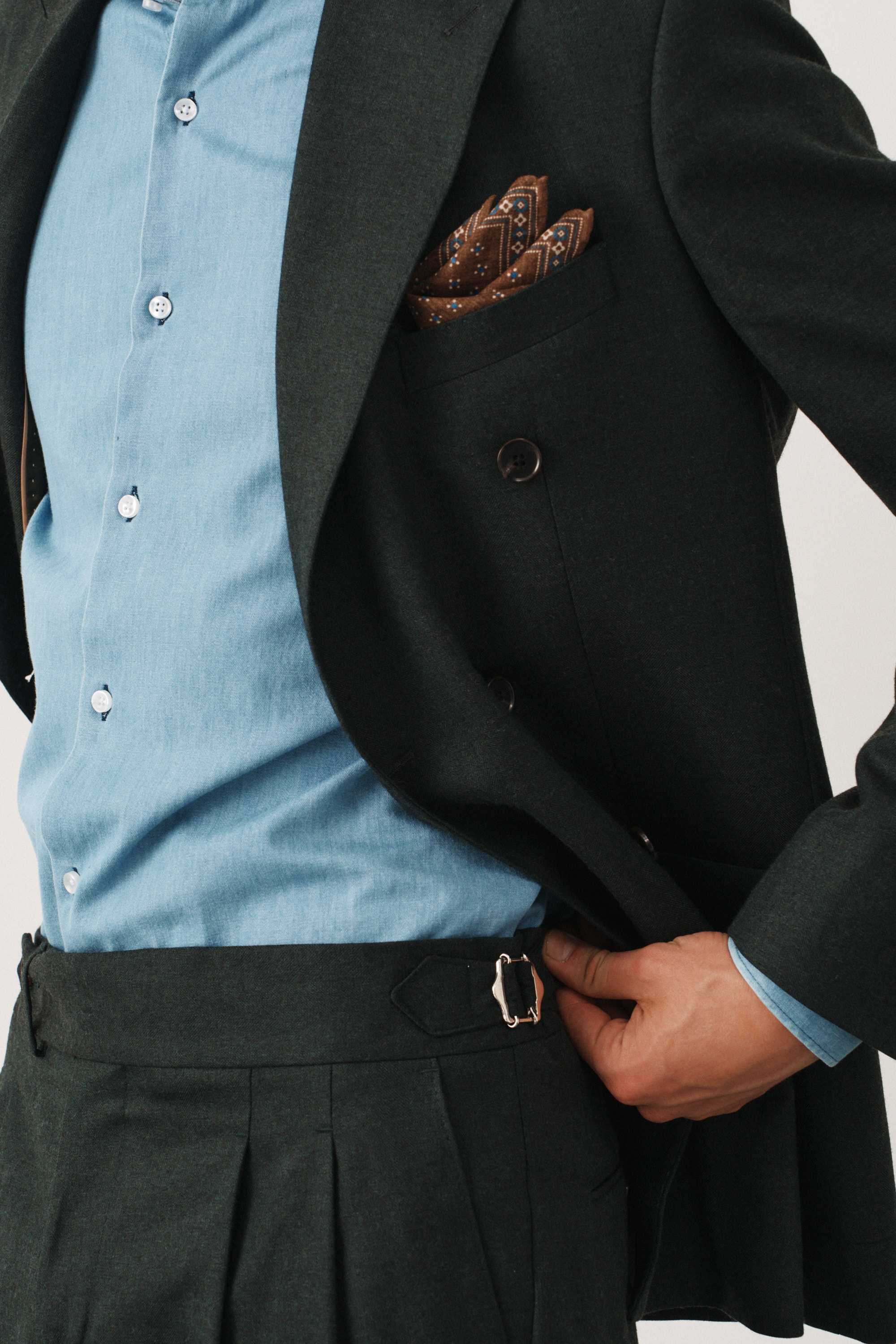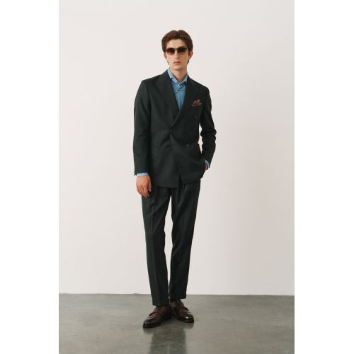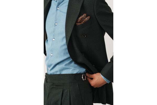 Костюм зеленый в елочку двубортный с накладными карманами, брюки с защипами
