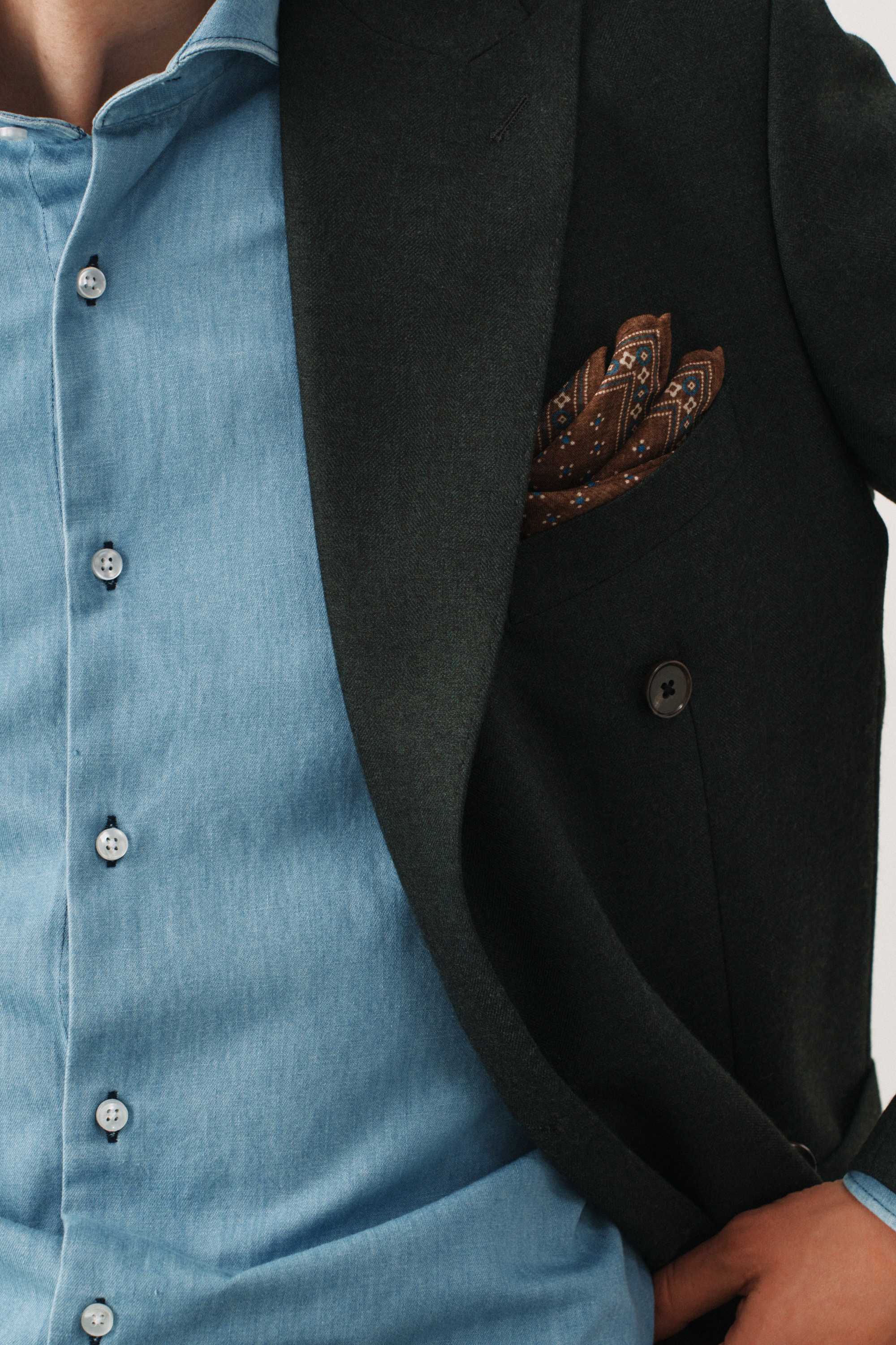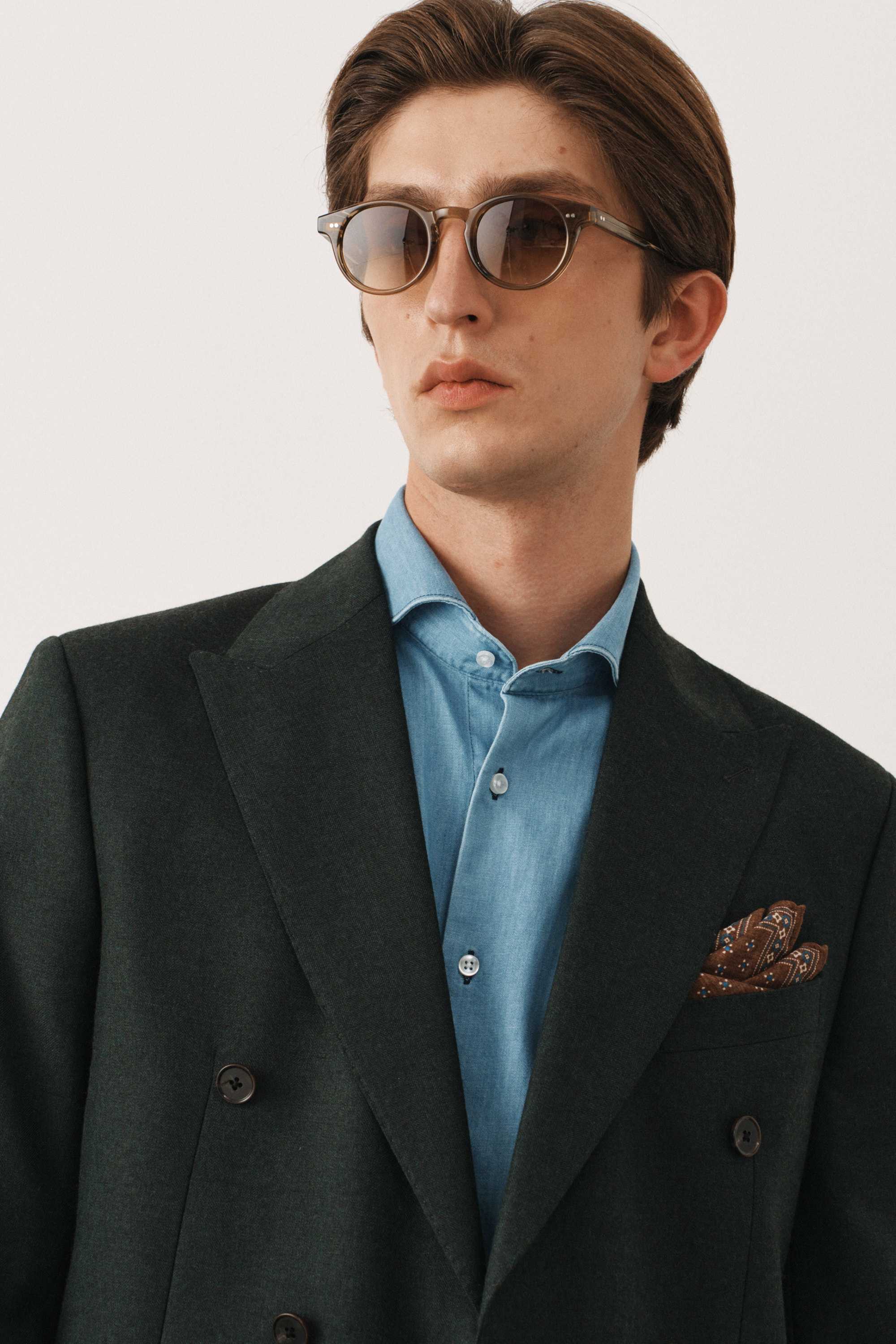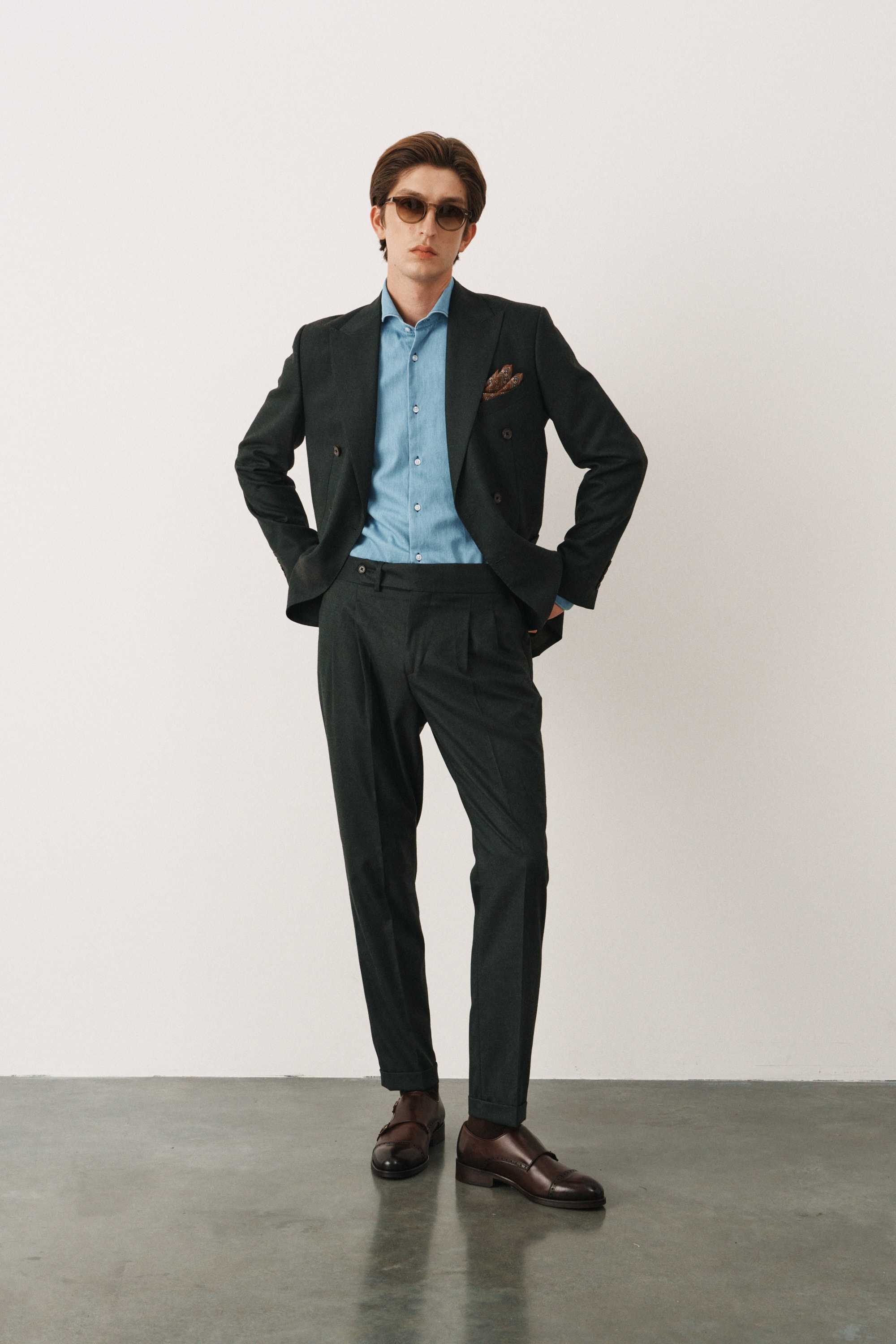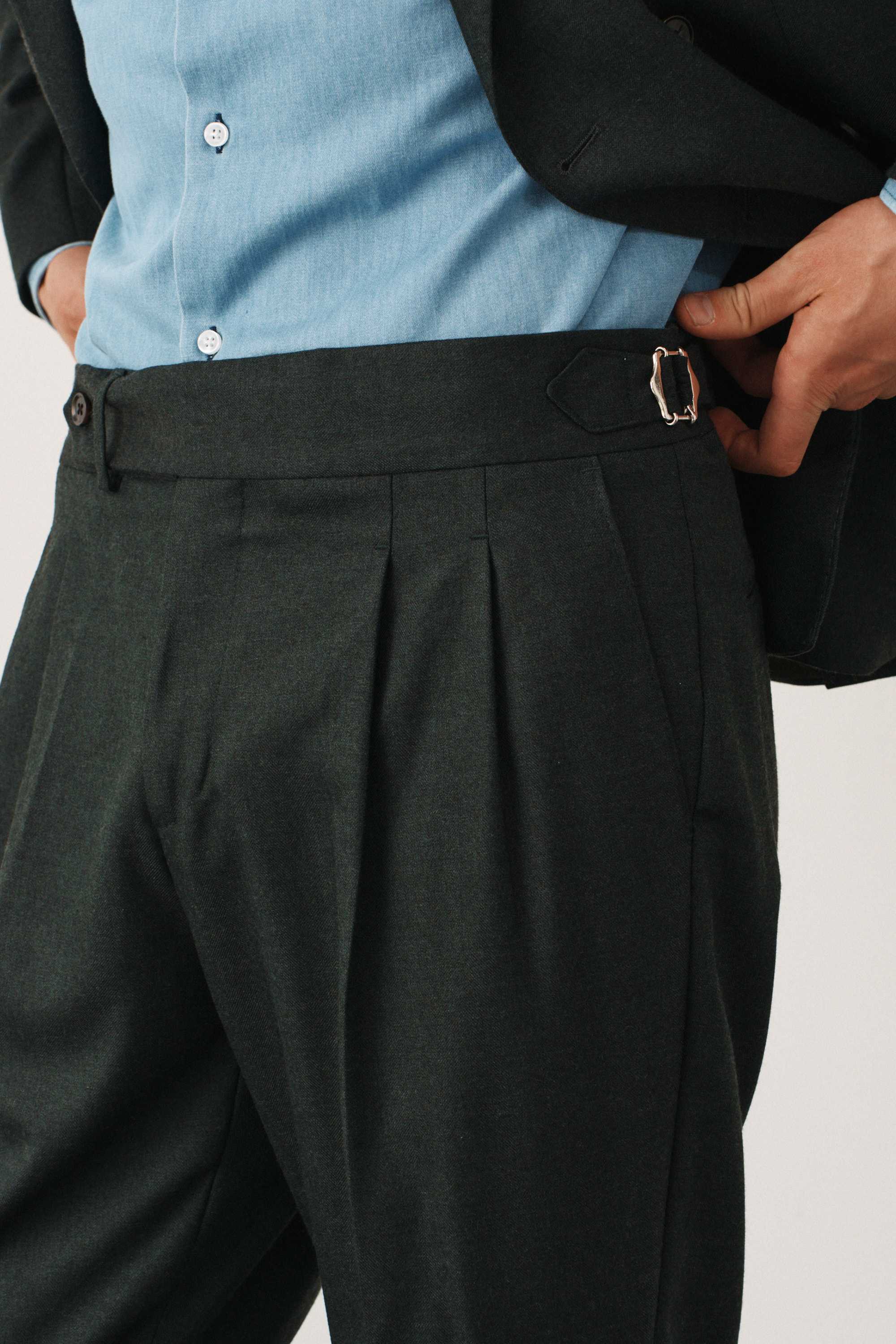 Костюм зеленый в елочку двубортный с накладными карманами, брюки с защипами