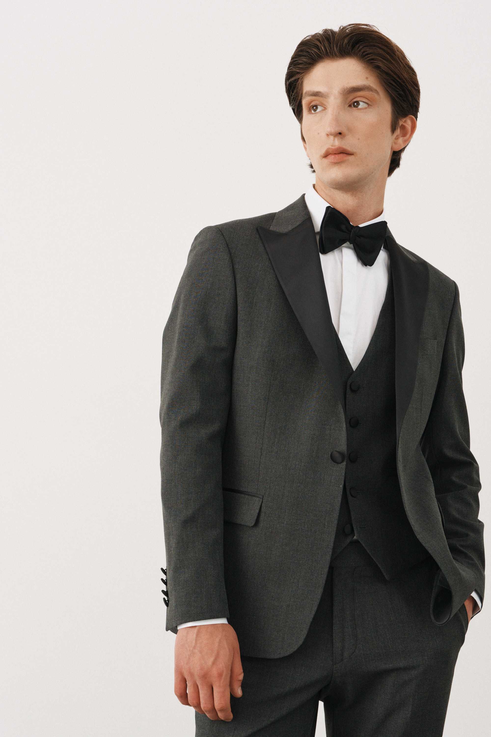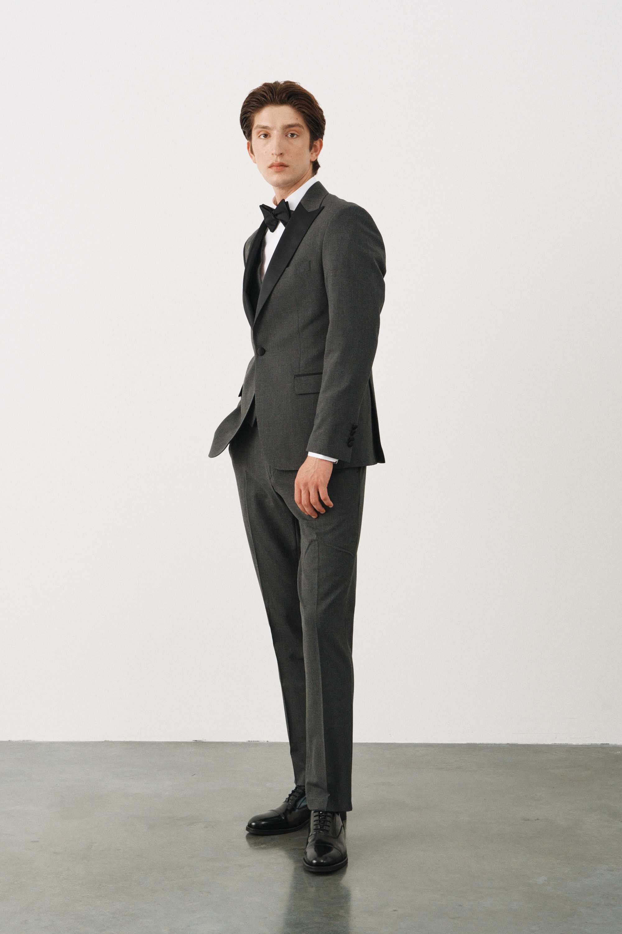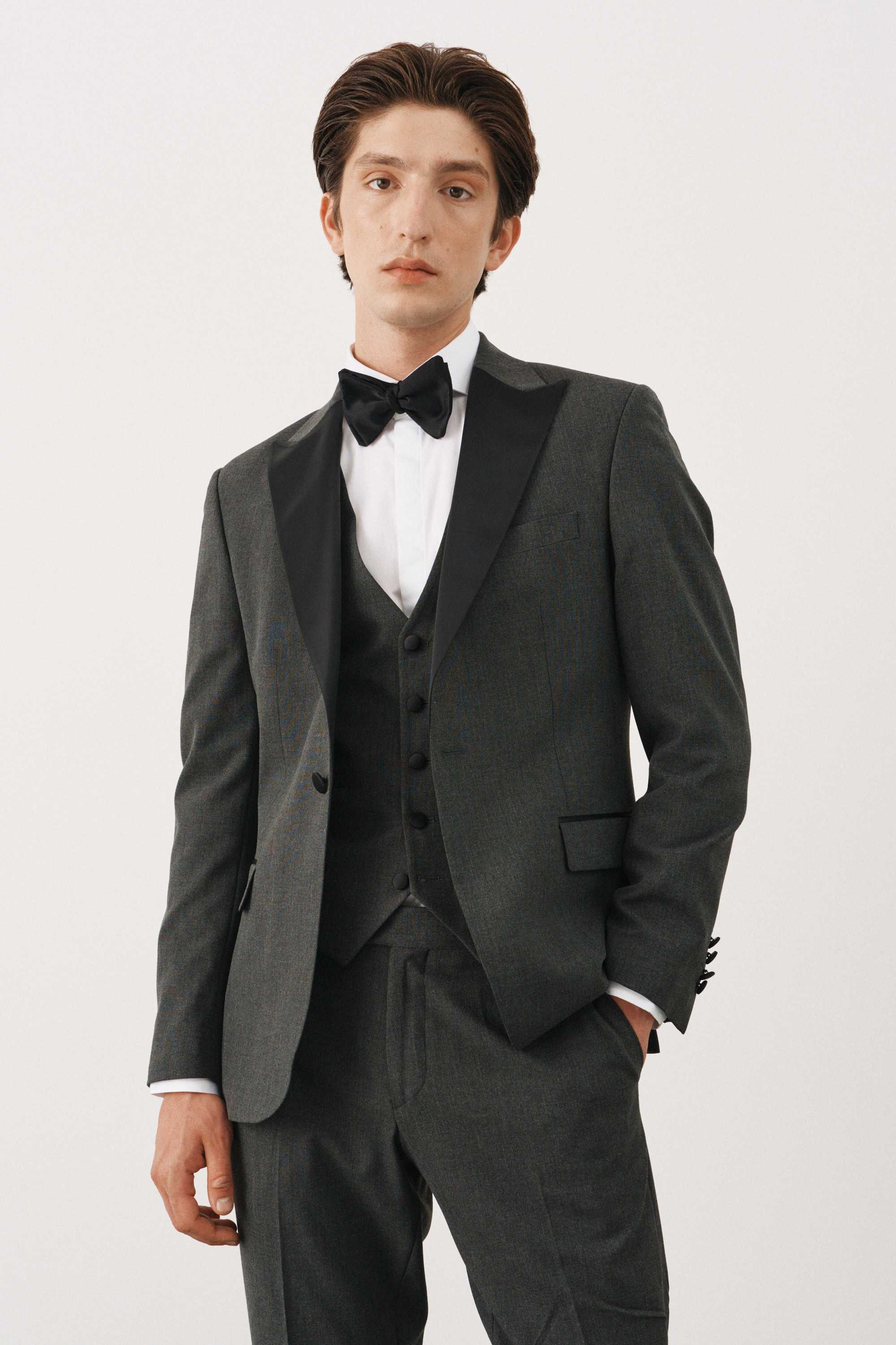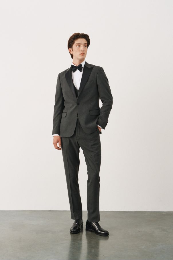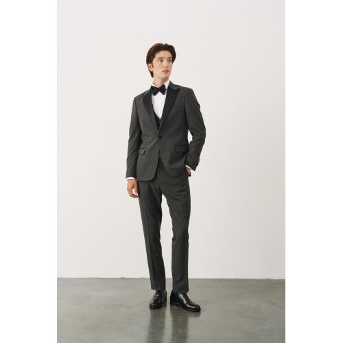 Костюм смокинг серый с черными итальянскими заостренными лацканами
