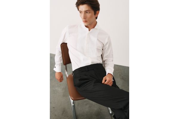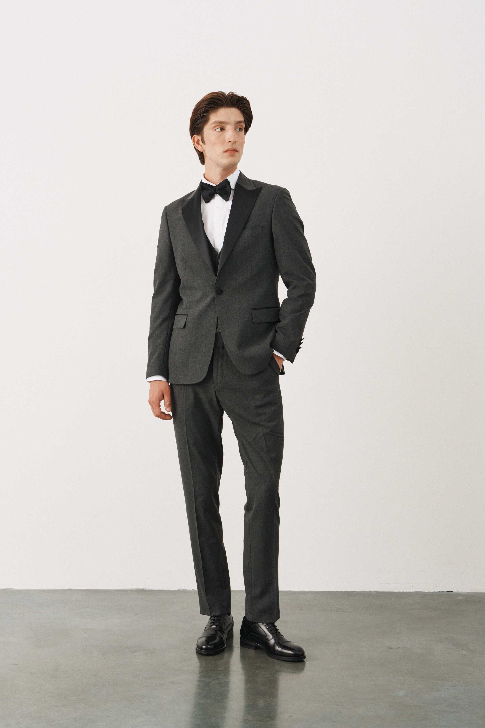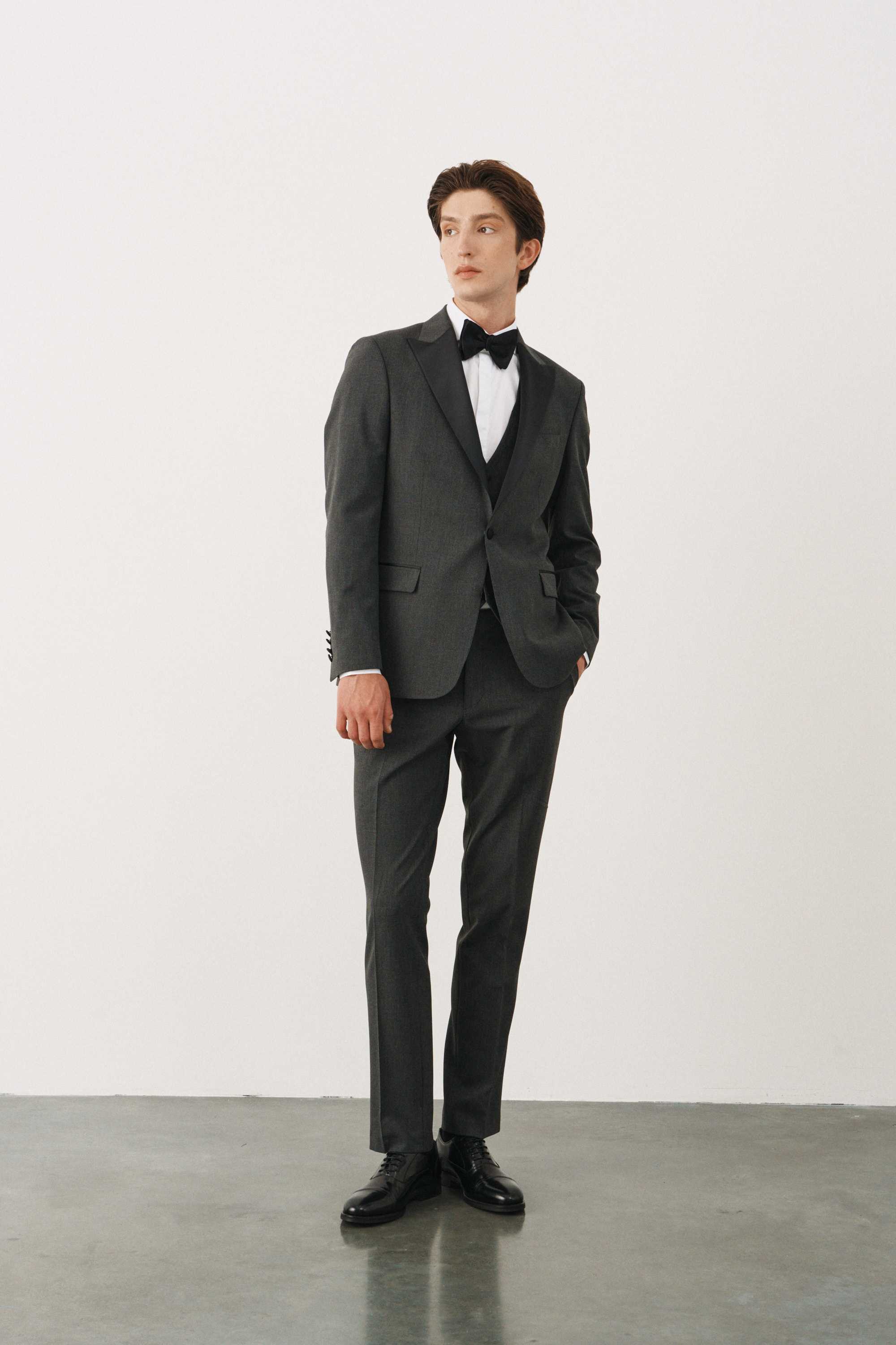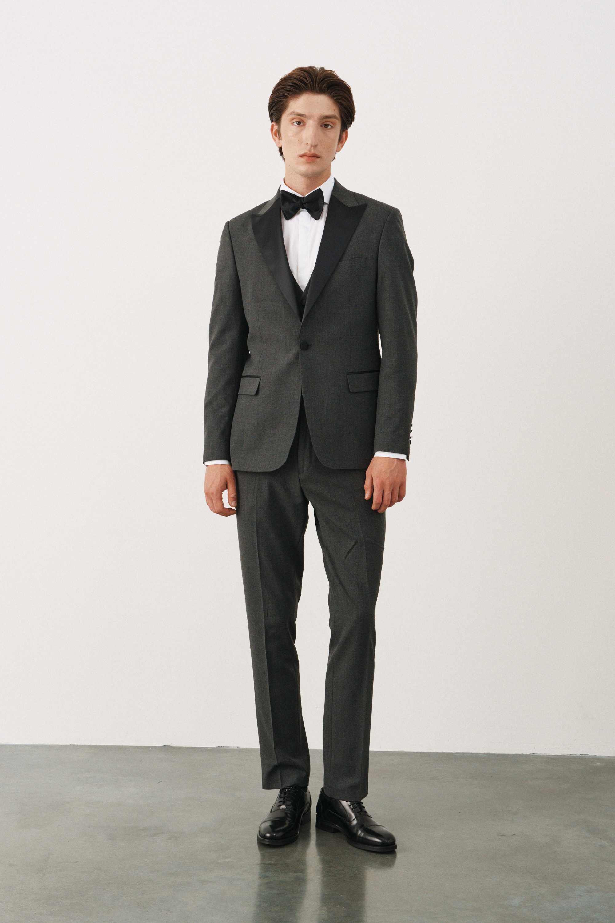 Костюм смокинг серый с черными итальянскими заостренными лацканами