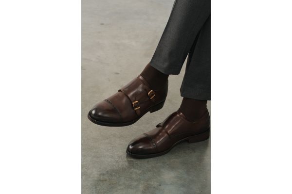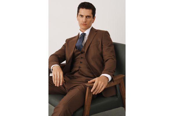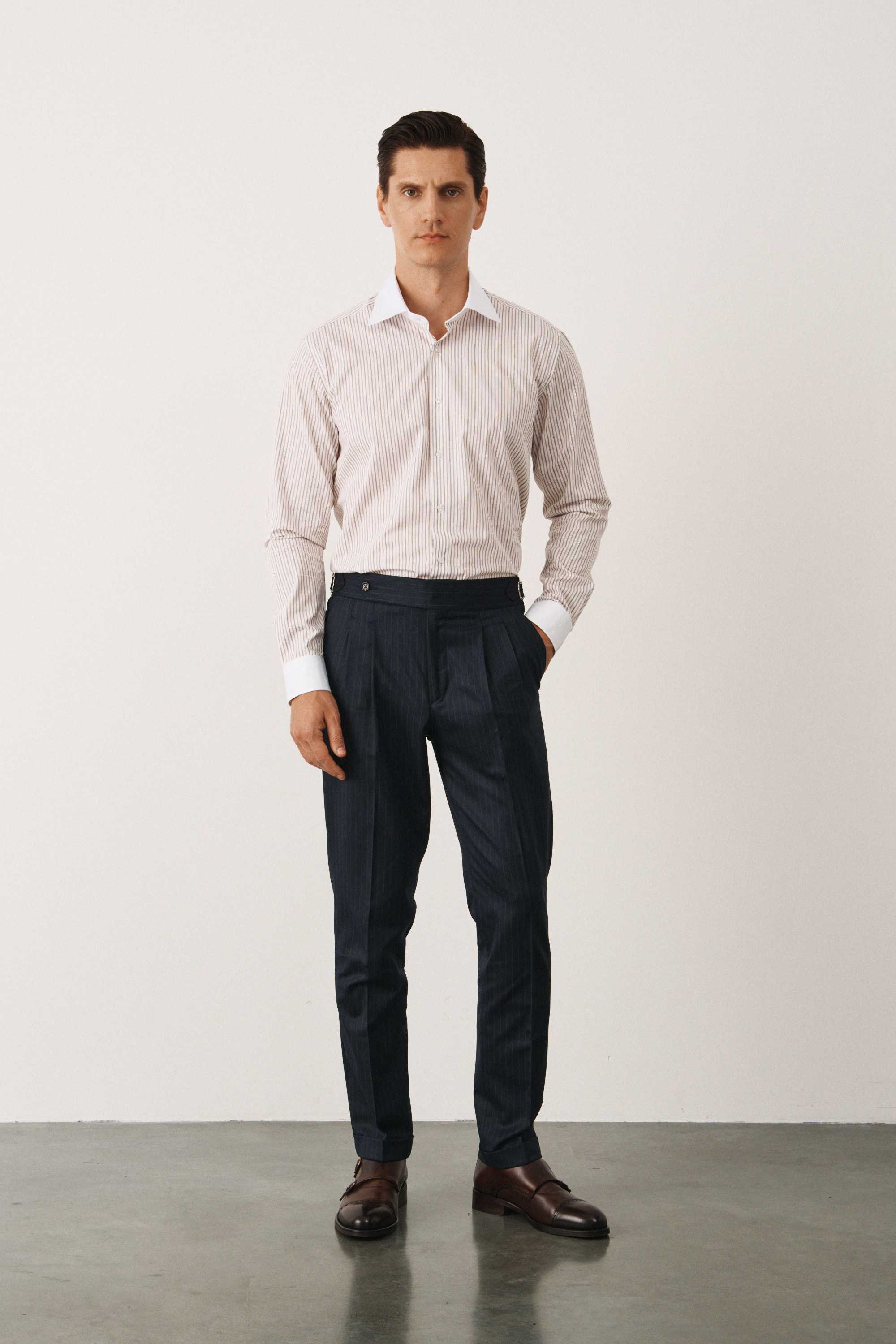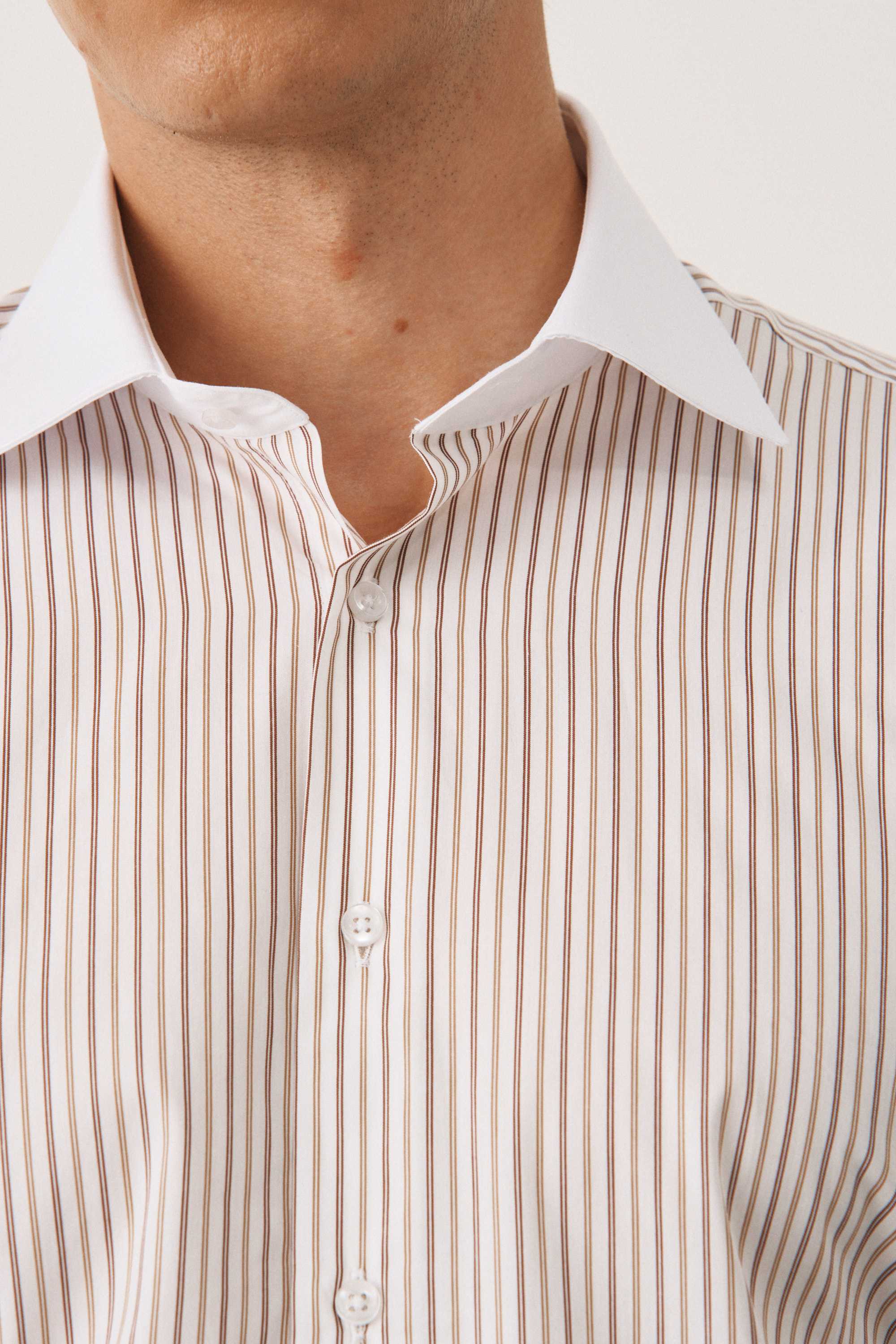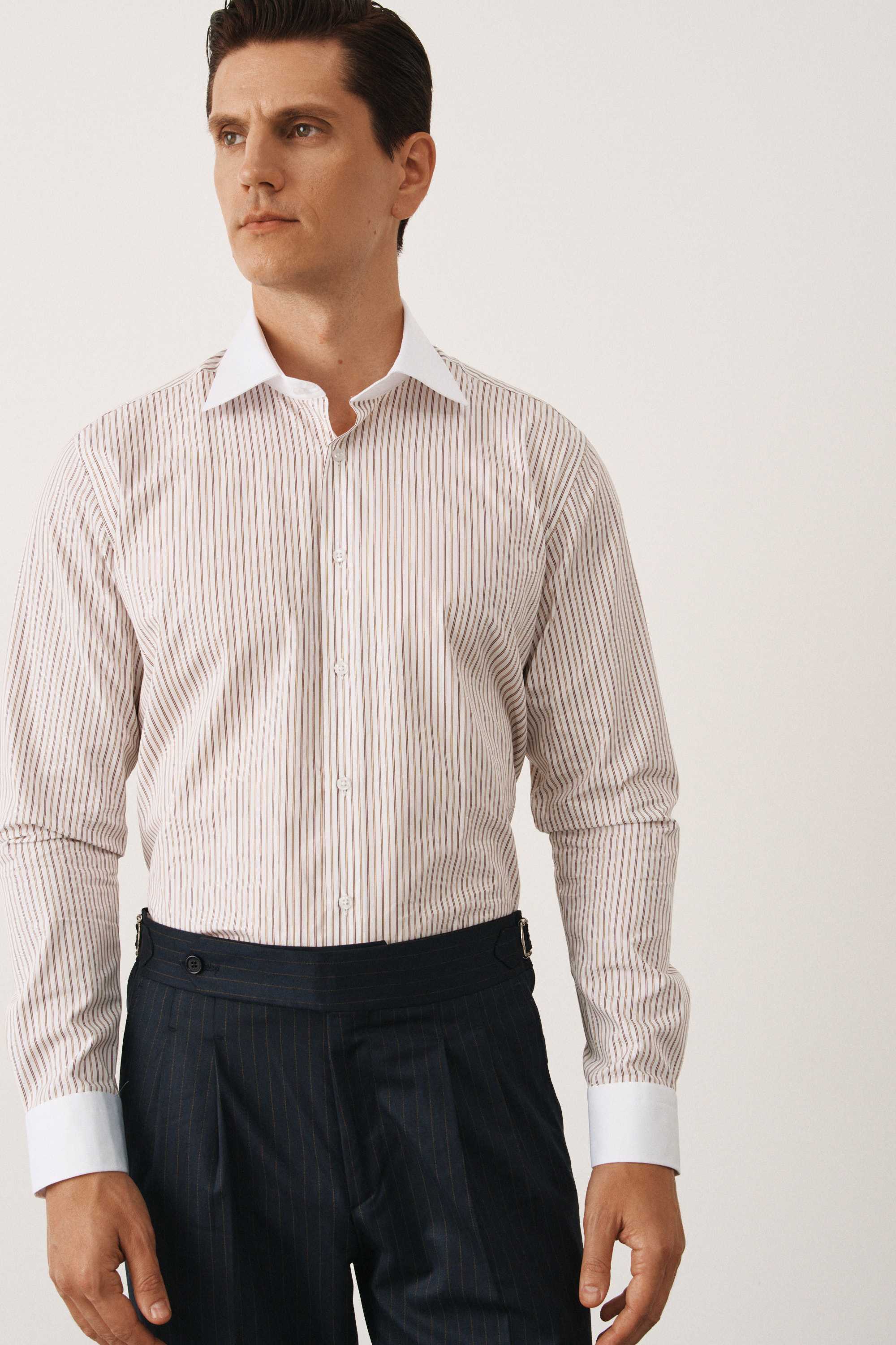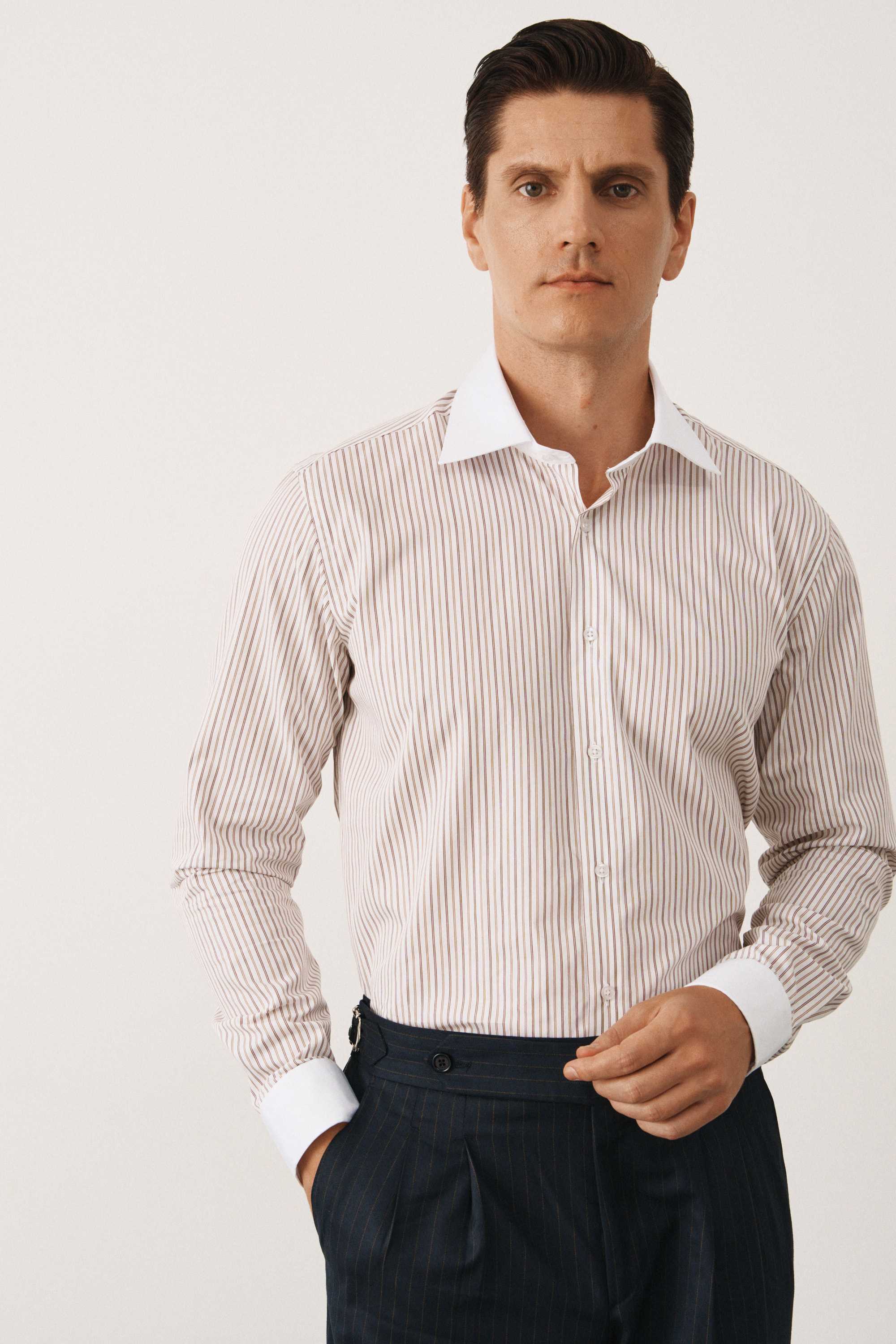 Рубашка в коричнево-рыжую полоску, с белыми воротником и манжетами