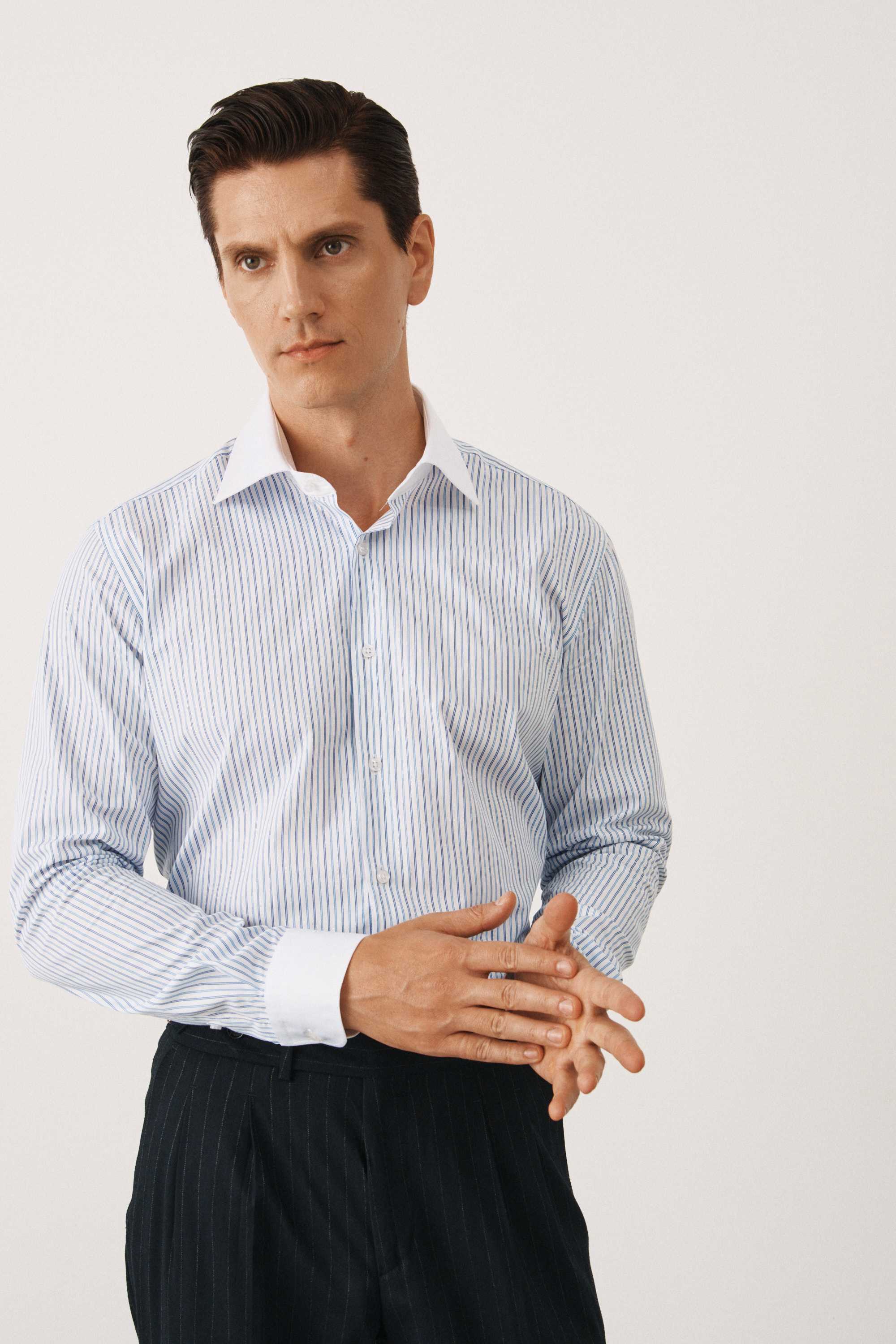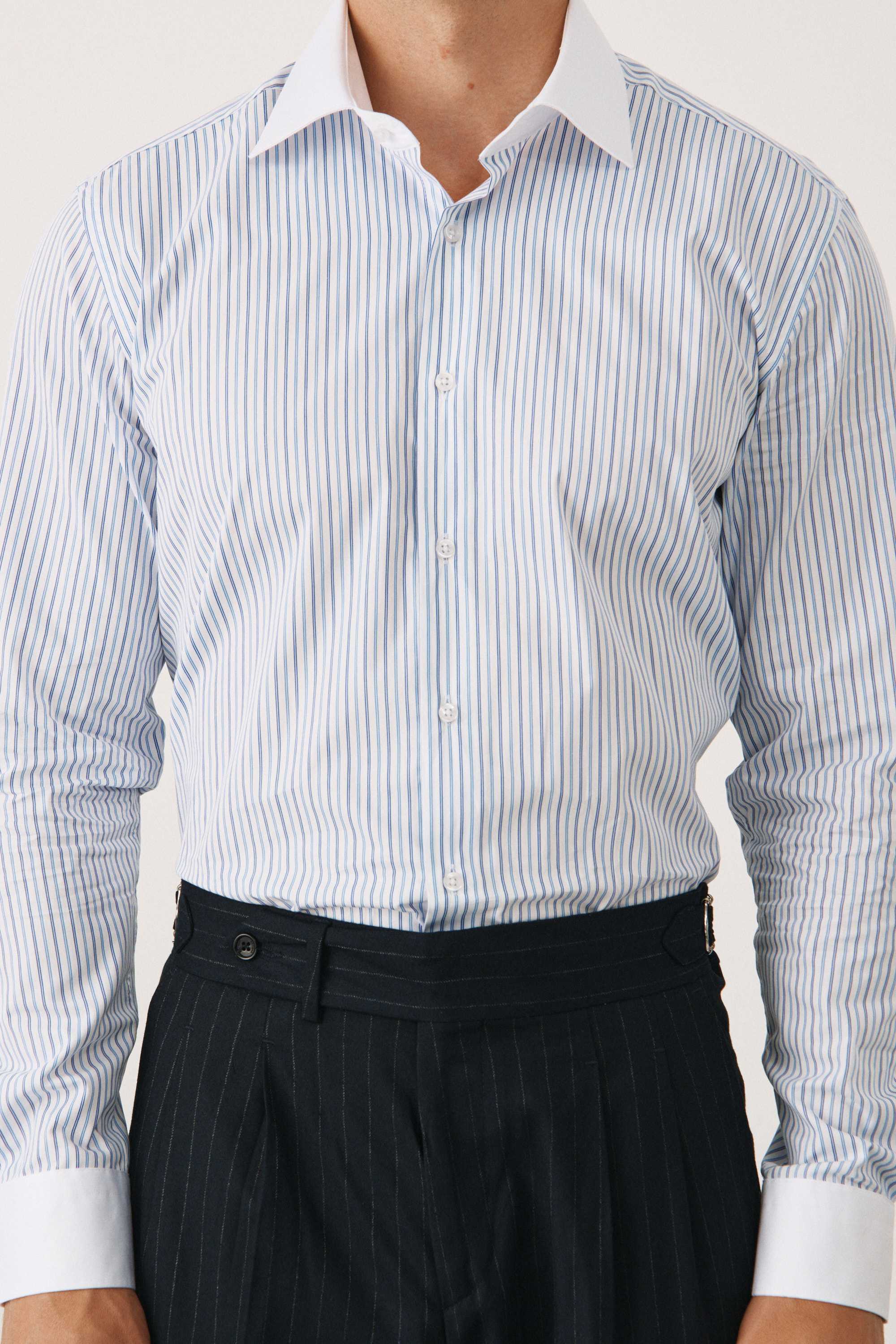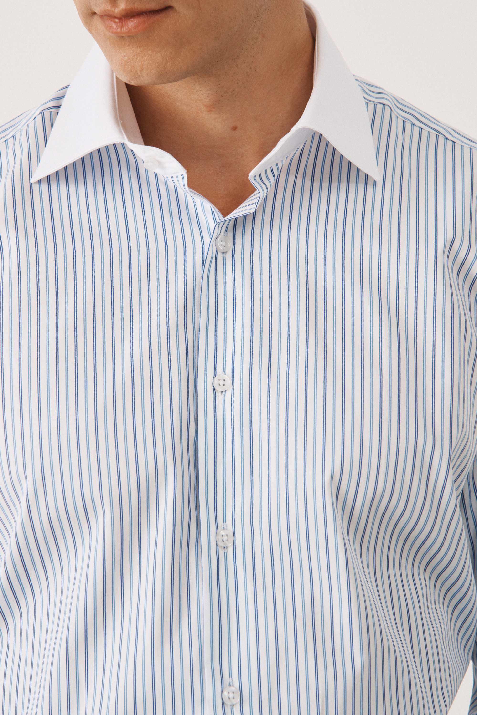 Рубашка в сине-голубую полоску, с белыми воротником и манжетами