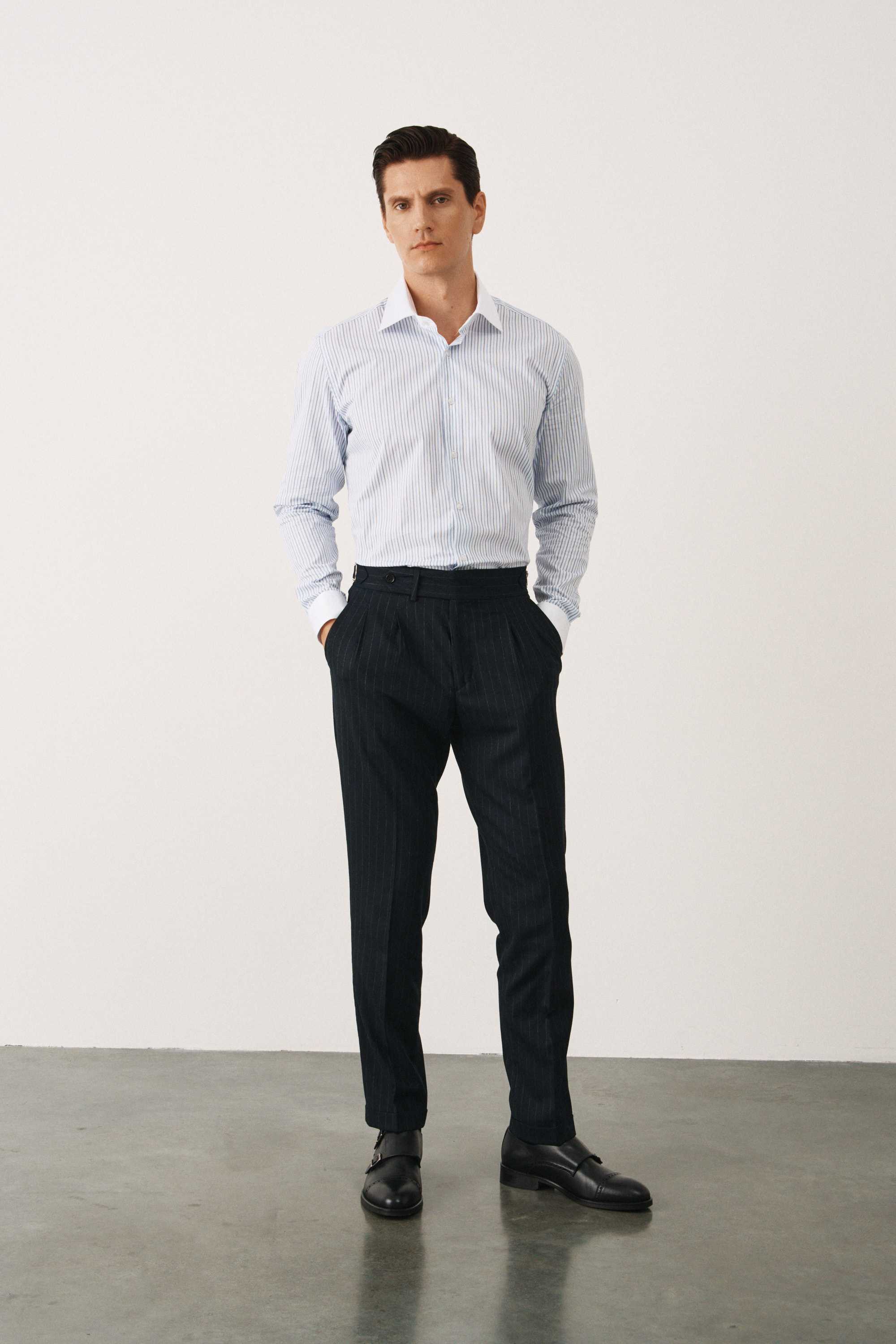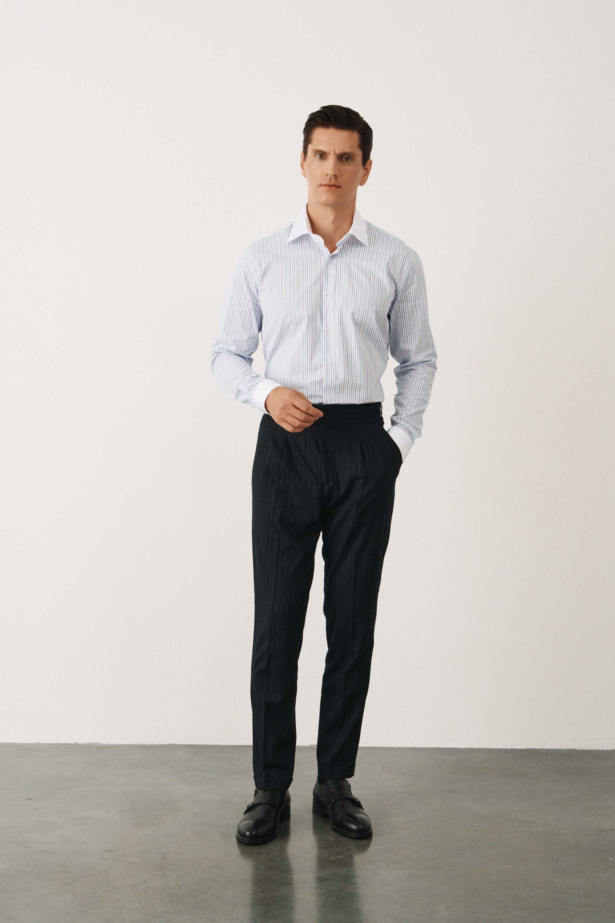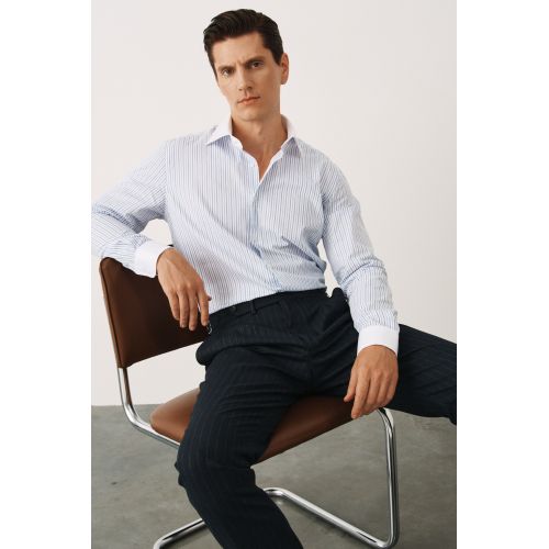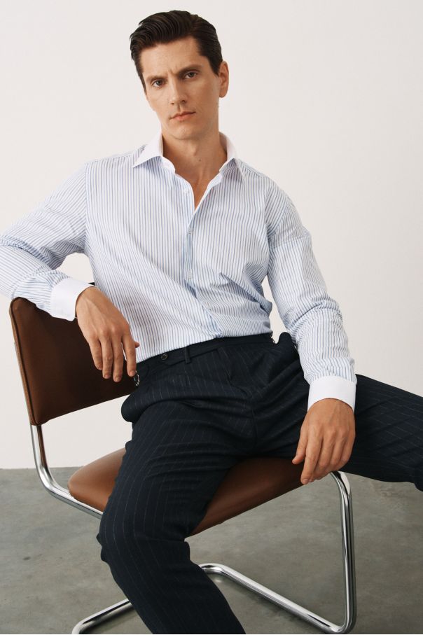 Рубашка в сине-голубую полоску, с белыми воротником и манжетами