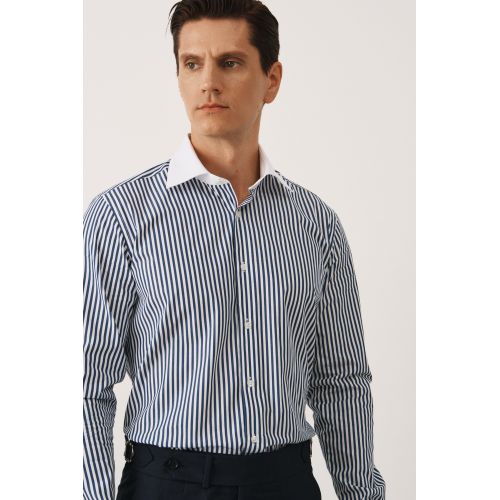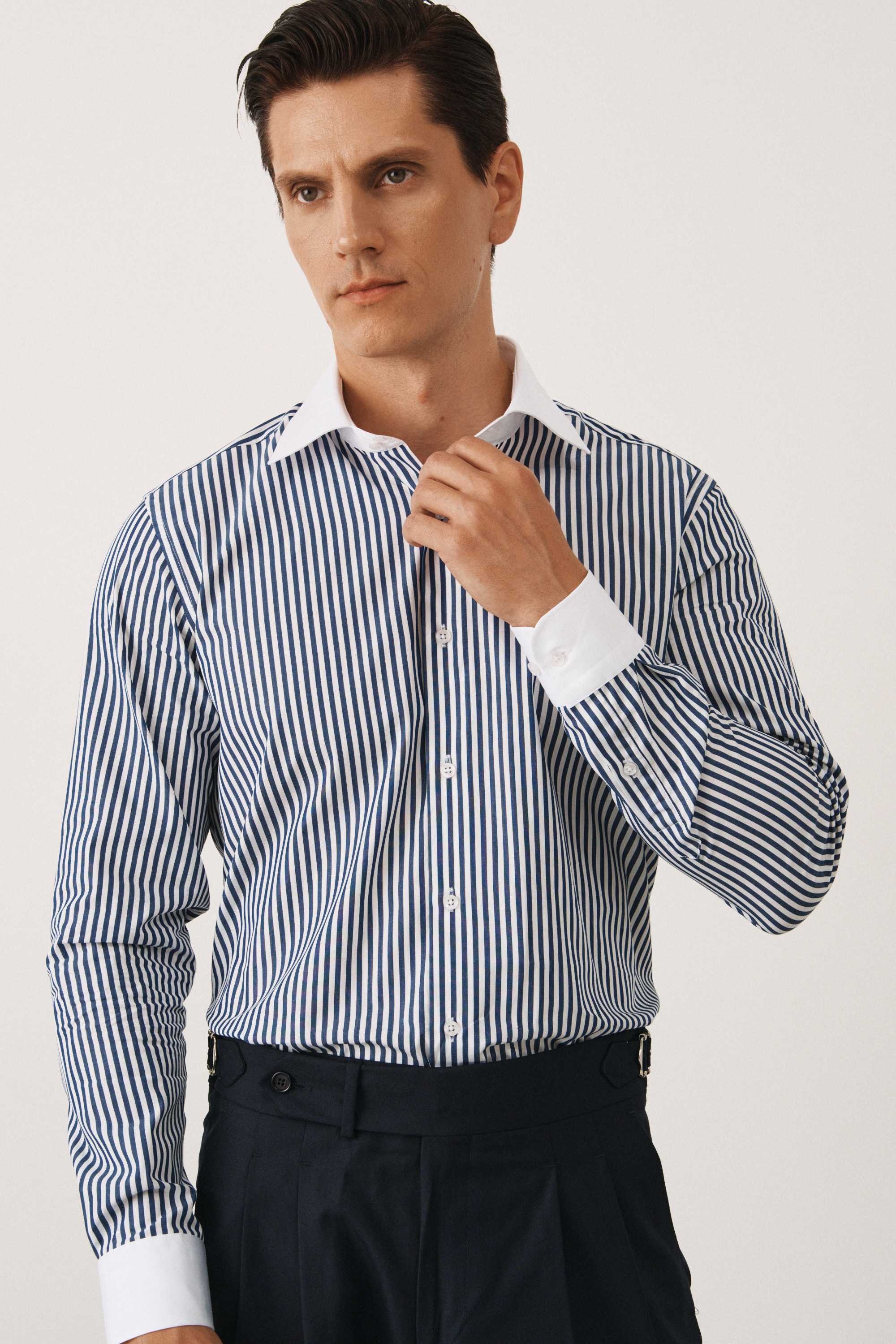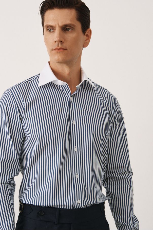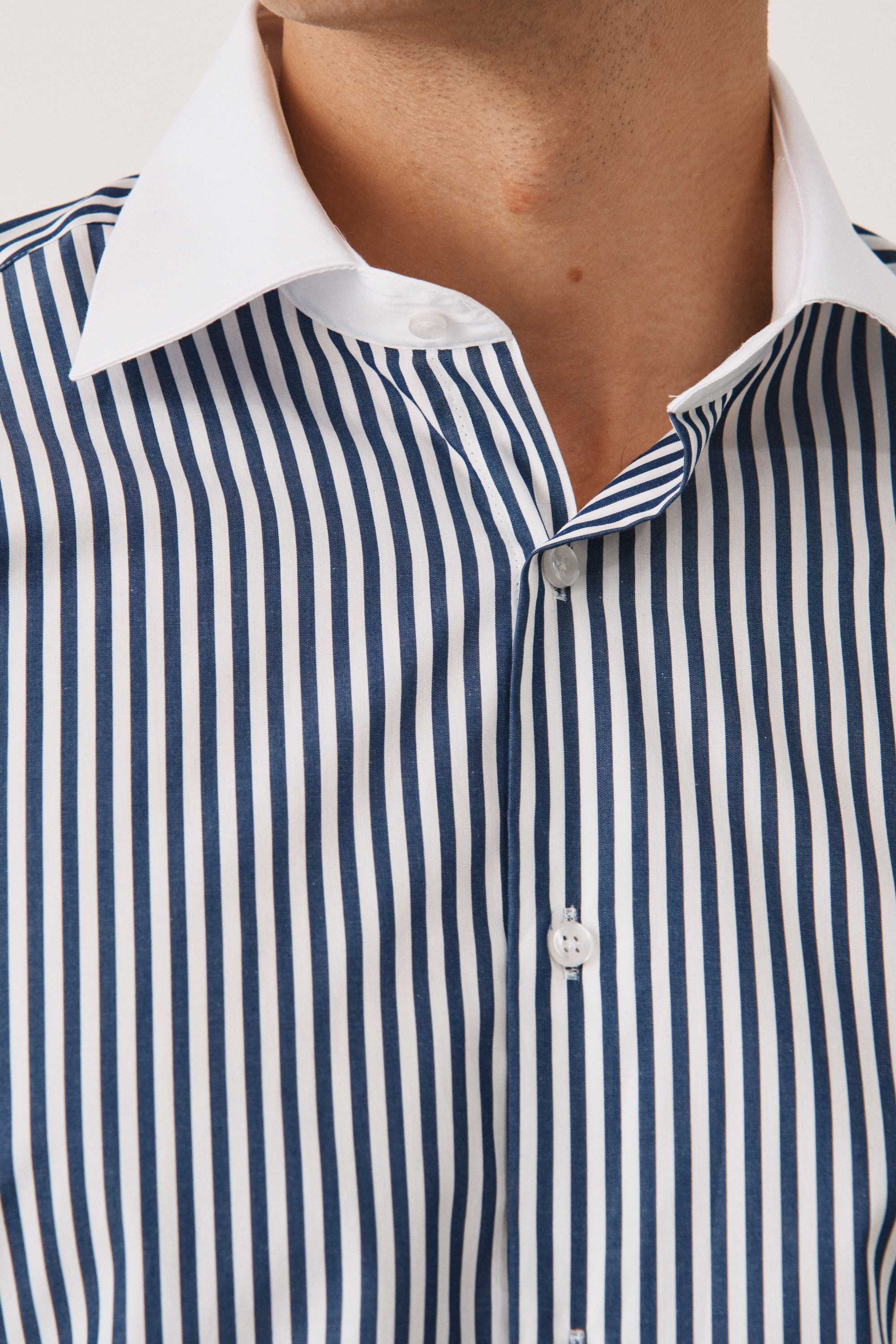 Рубашка в темно-синюю полоску, с белыми воротником и манжетами