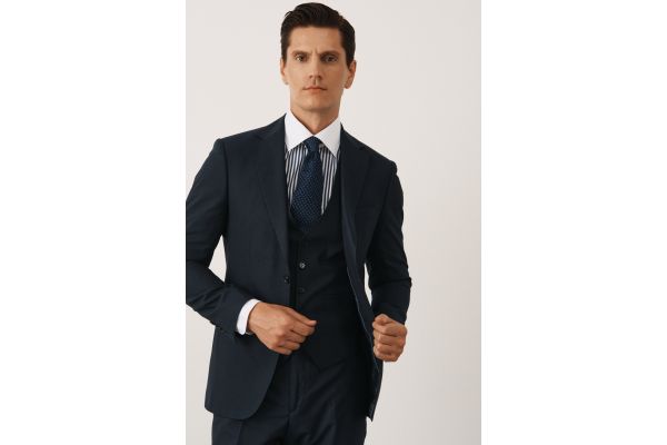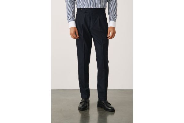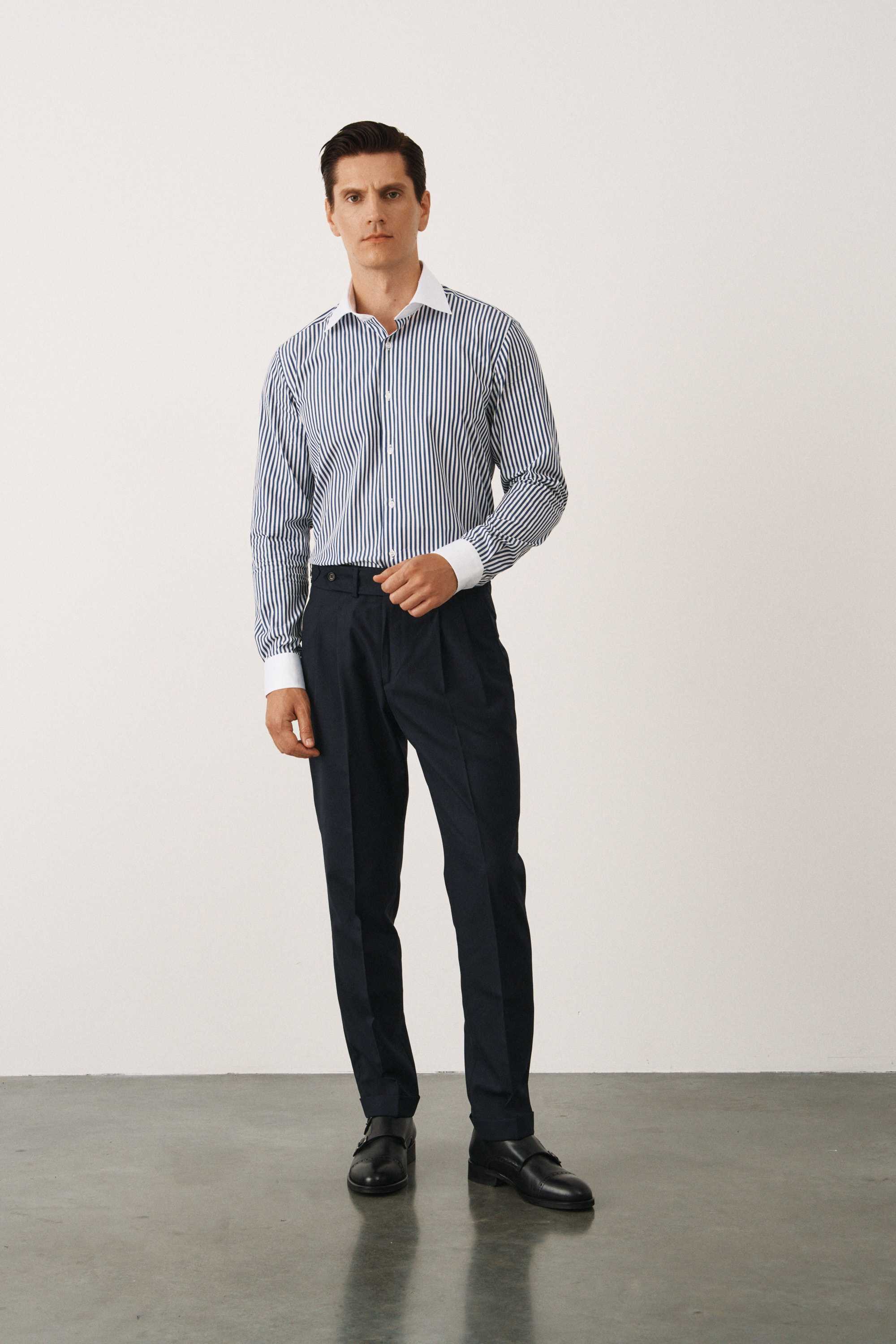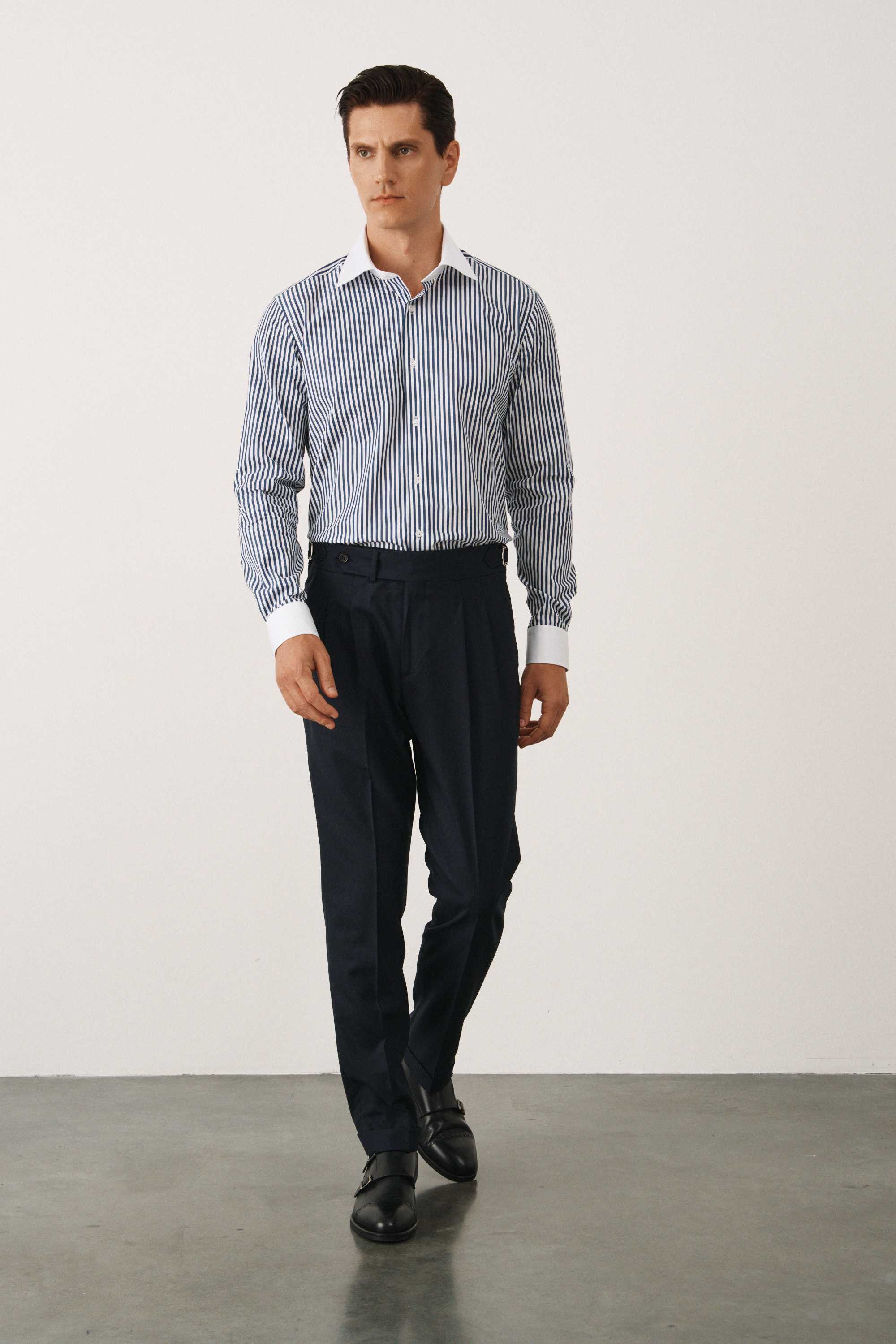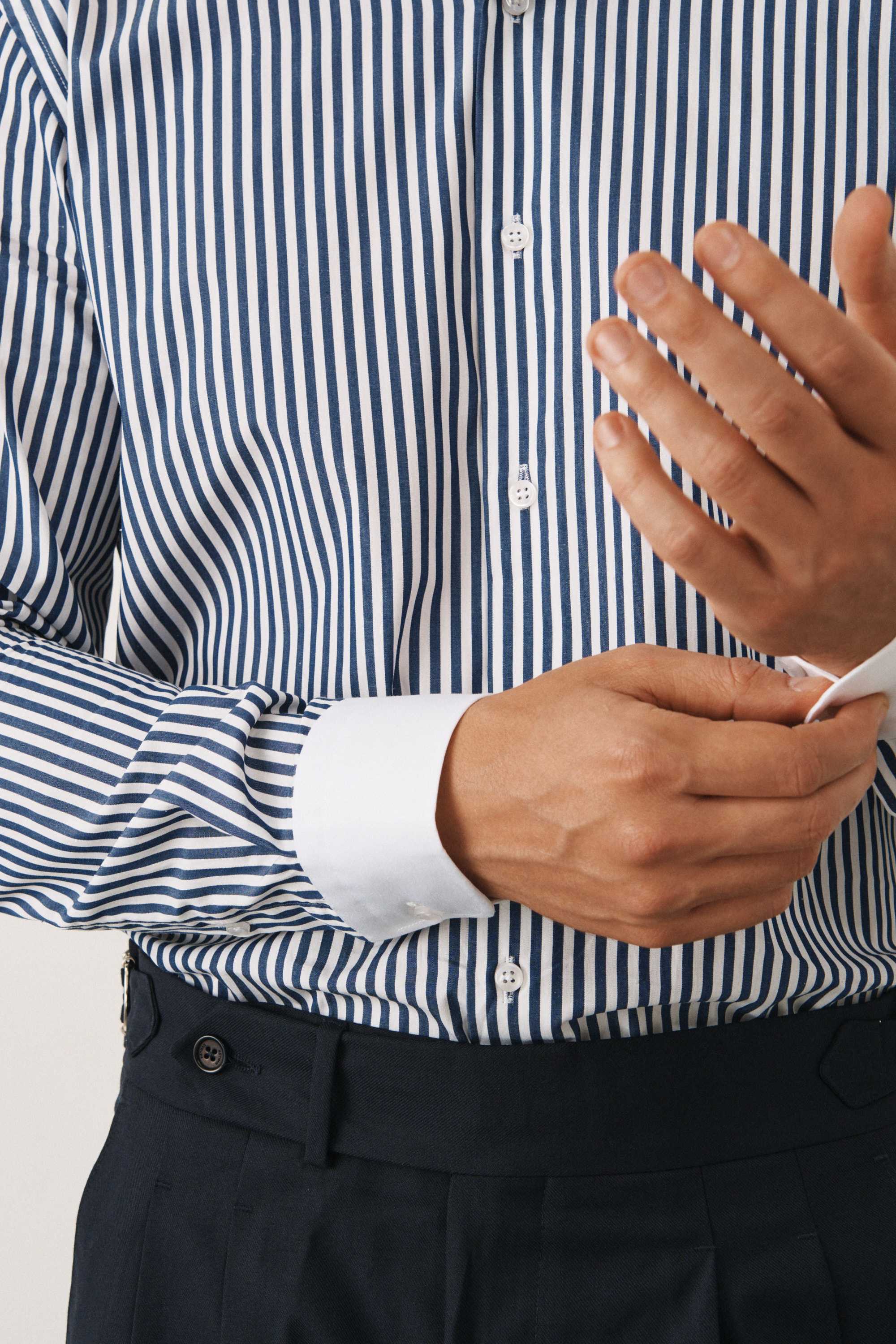 Рубашка в темно-синюю полоску, с белыми воротником и манжетами